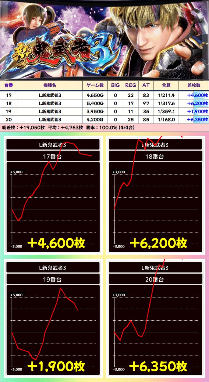 【4台並び】新鬼武者3(17-20番台)→平均+4,763枚