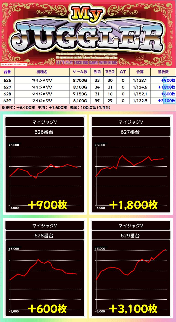 【4台並び】マイジャグV(626-629番台)→平均+1,600枚
