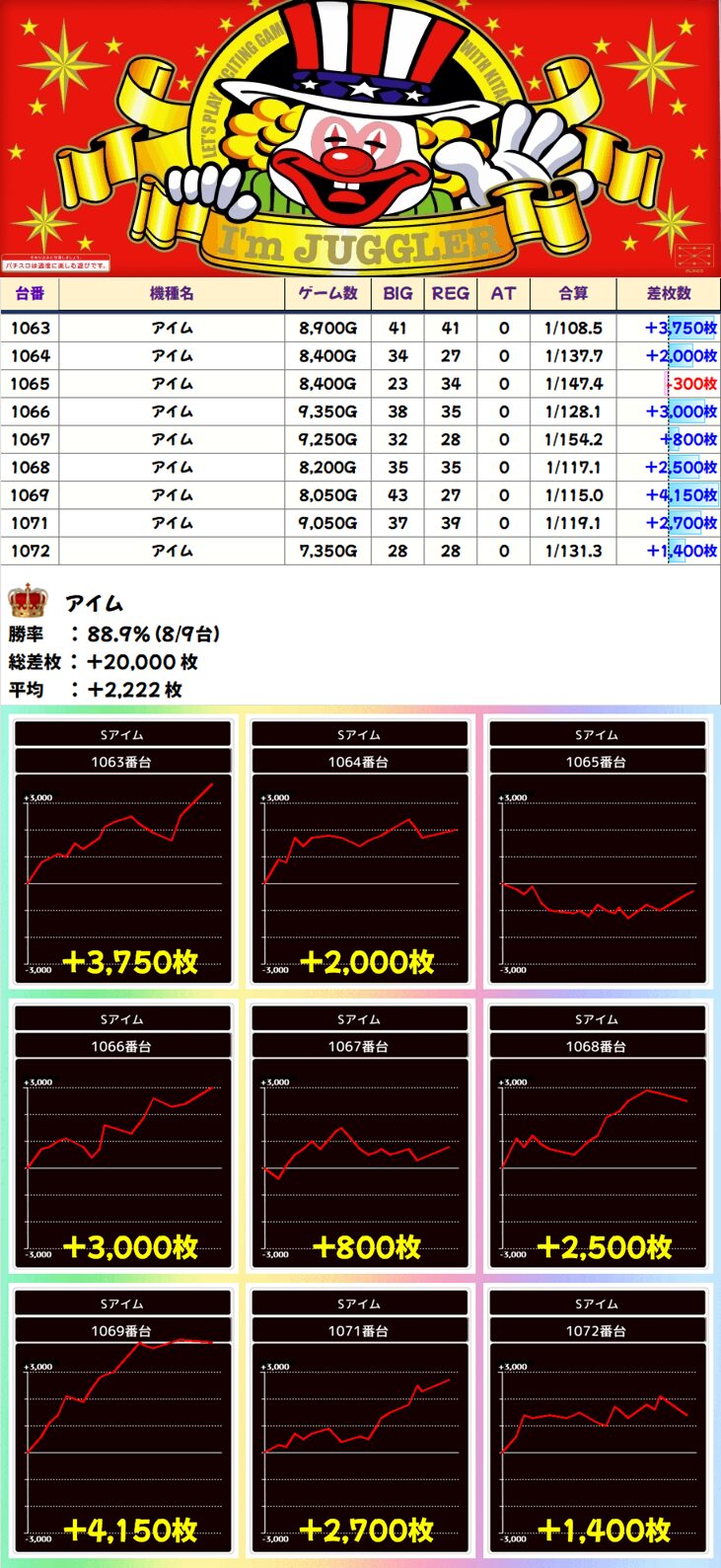 かぶぱポストから全台系濃厚機種が2機種あり、いずれもジャグが好結果を残す!おしくもアイムの1台がマイナスですが、安定感抜群の結果に!