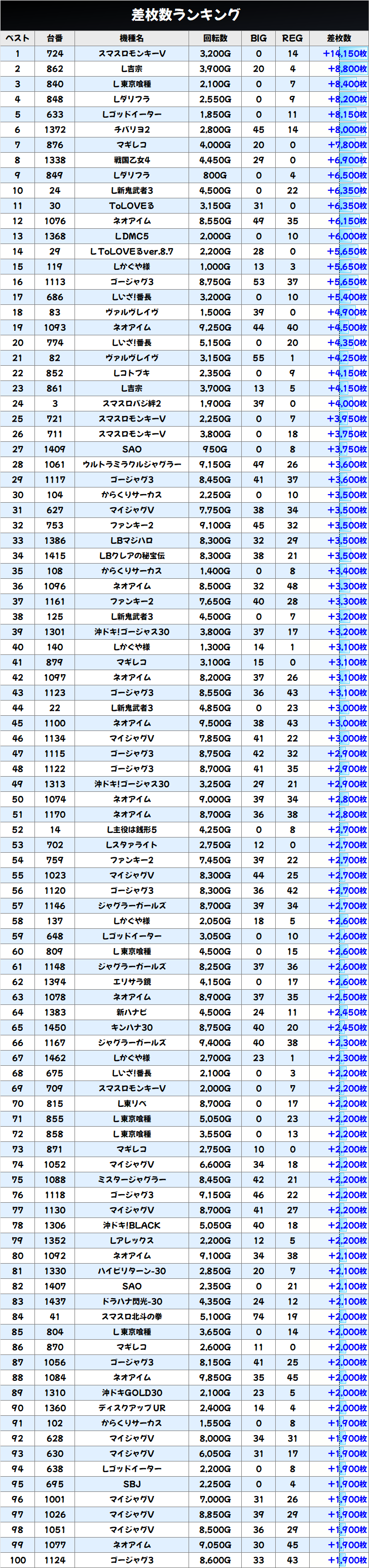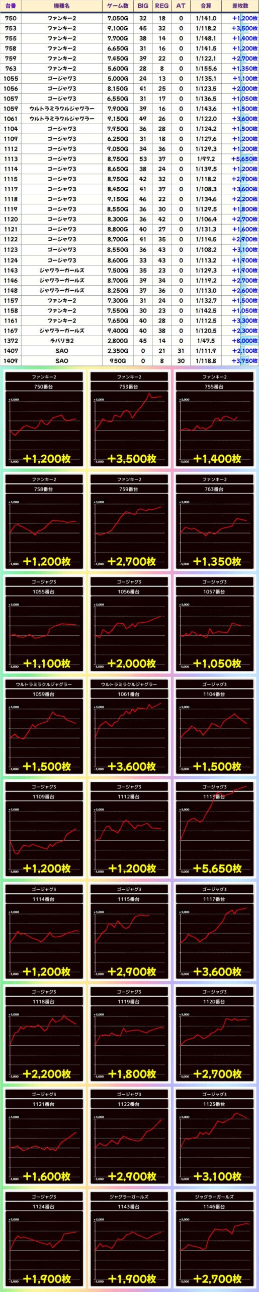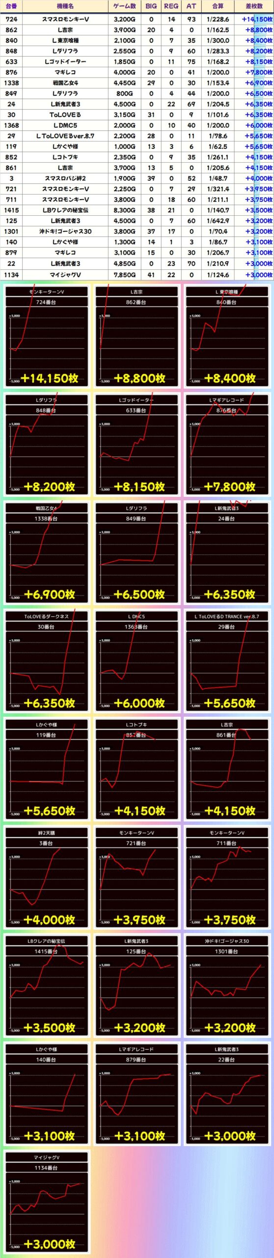 各機種の優秀台(+2000枚以上)をピックアップしていきますので、データをチェックして明日以降の参考にしてください!