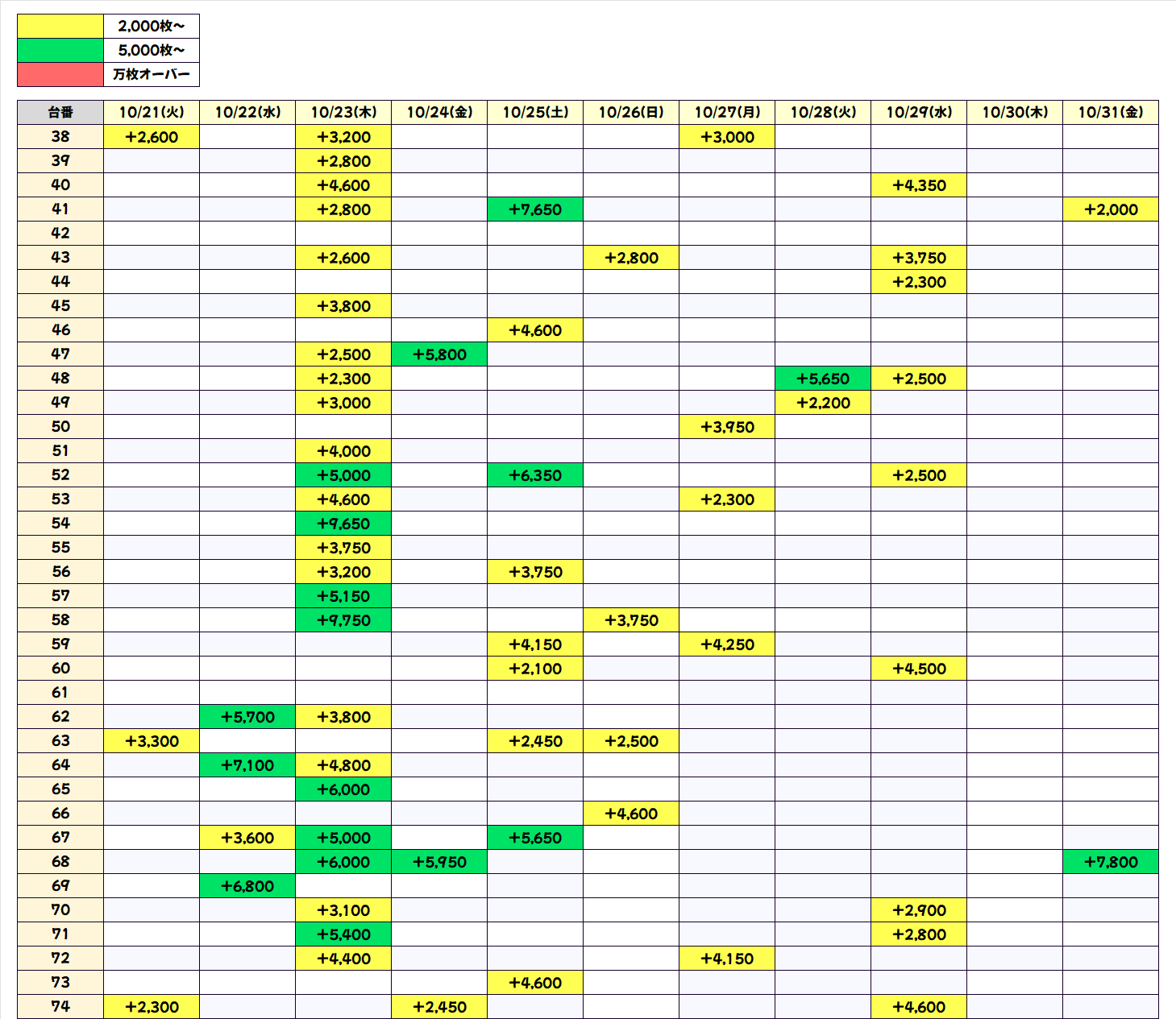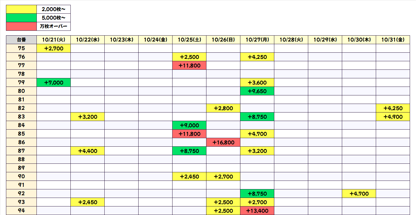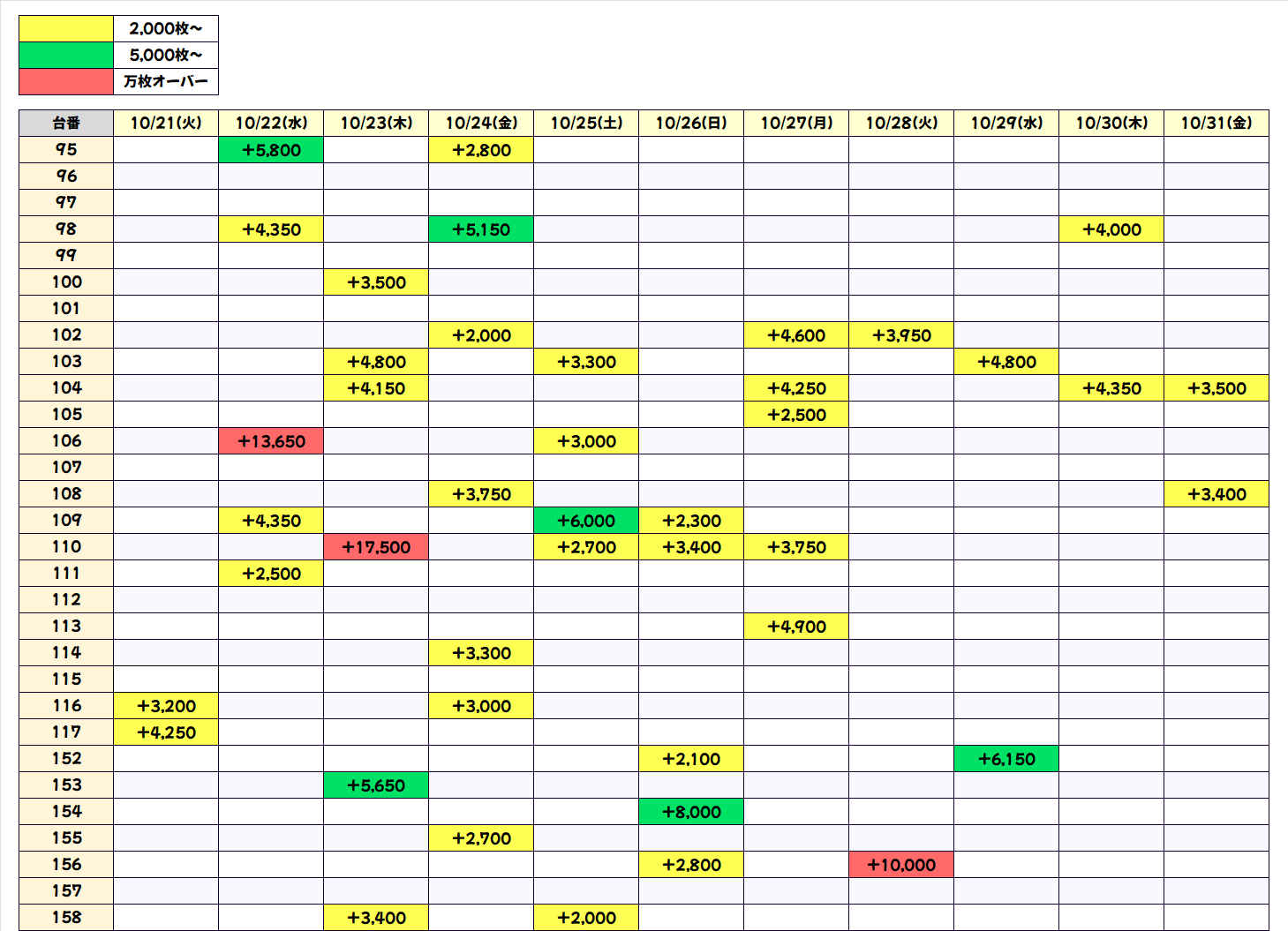 各機種の優秀台(+2000枚以上)をピックアップしていきますので、データをチェックして明日以降の参考にしてください!