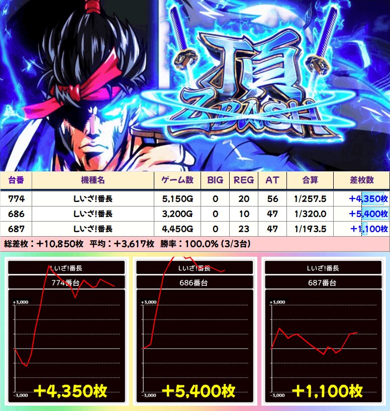 【3台並び】いざ番長(774・686-687番台)→Ave+3,617枚