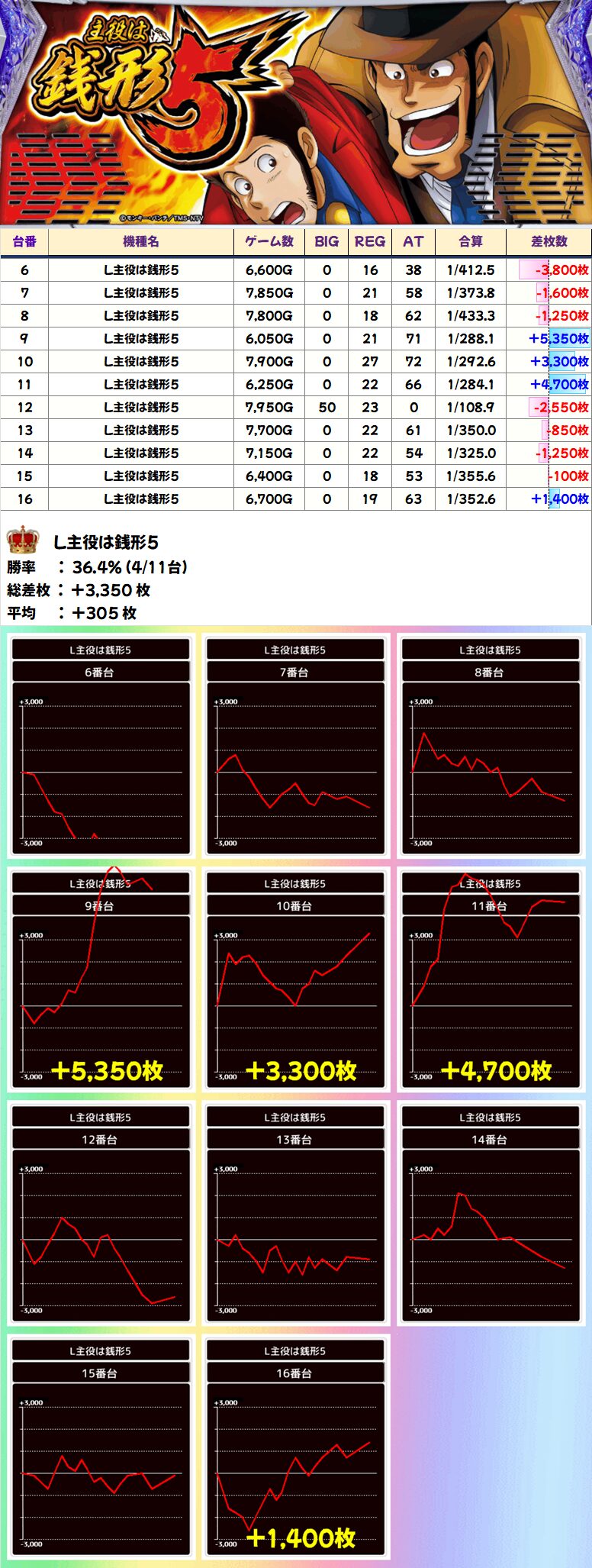L主役は銭形5 (4/11台+) ➡平均 +305枚