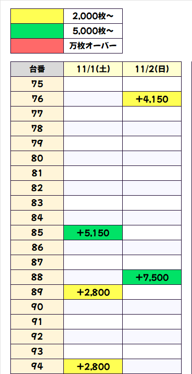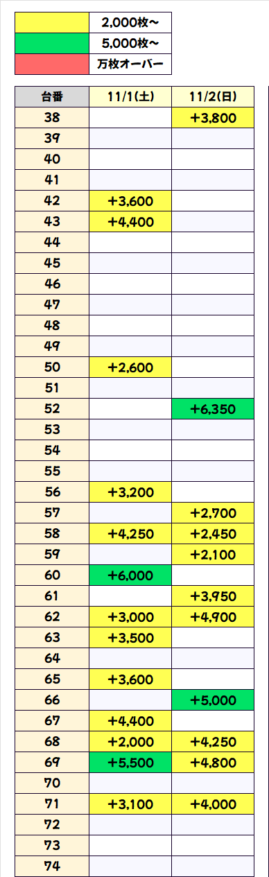今回は10/2の結果をレポート。この日は毎回総差枚+10万枚クラスの好成績にも期待でき、そこまでライバルが多いというわけでもないため、かなり狙い目の一日となっております!