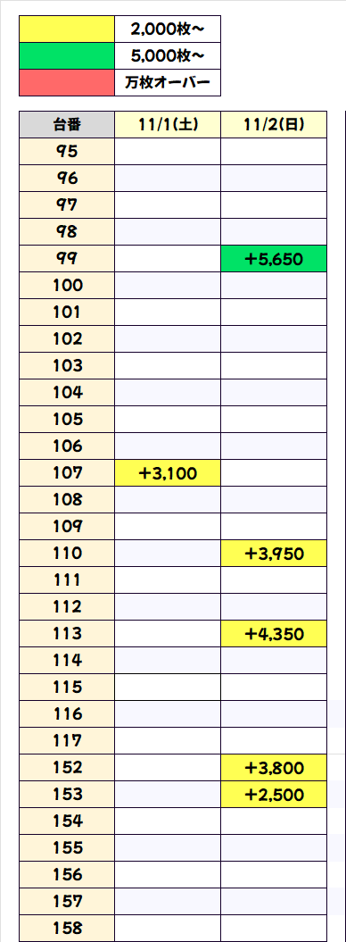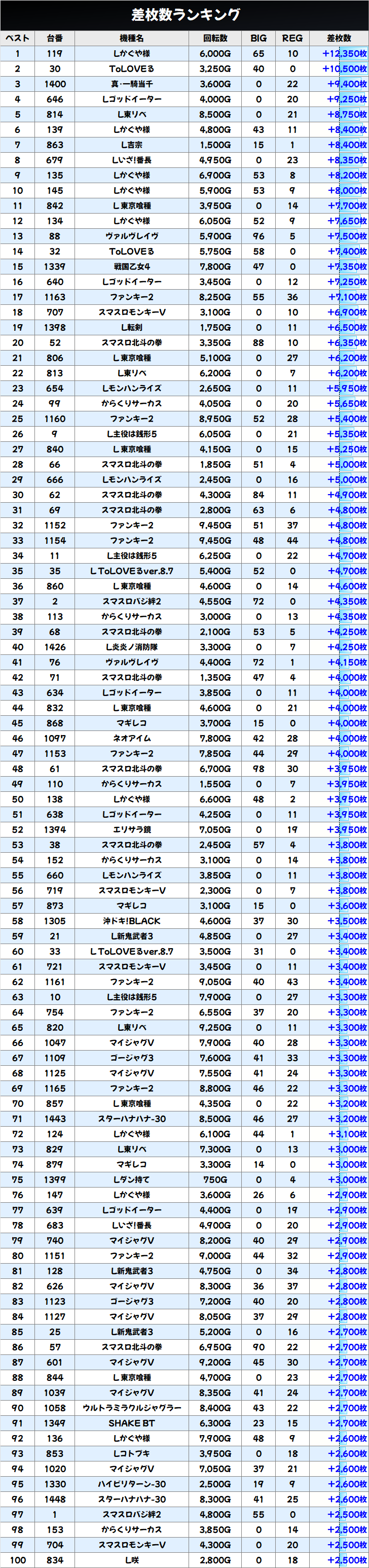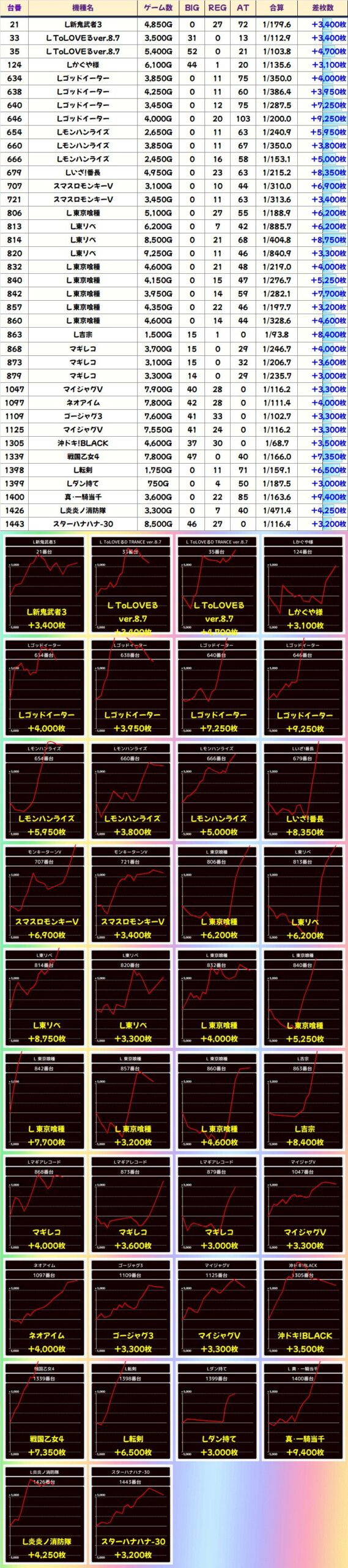 今回も上記3機種の優秀台(+2000枚以上)をピックアップしていきます。データをチェックして明日以降の参考にしてください!
