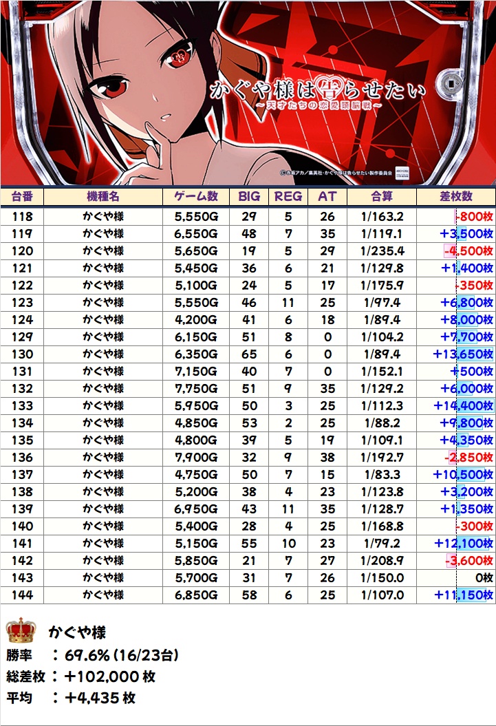 +14000枚以上など万枚オーバーだけで5台、勝率も7割と高く平均+4435枚を達成!