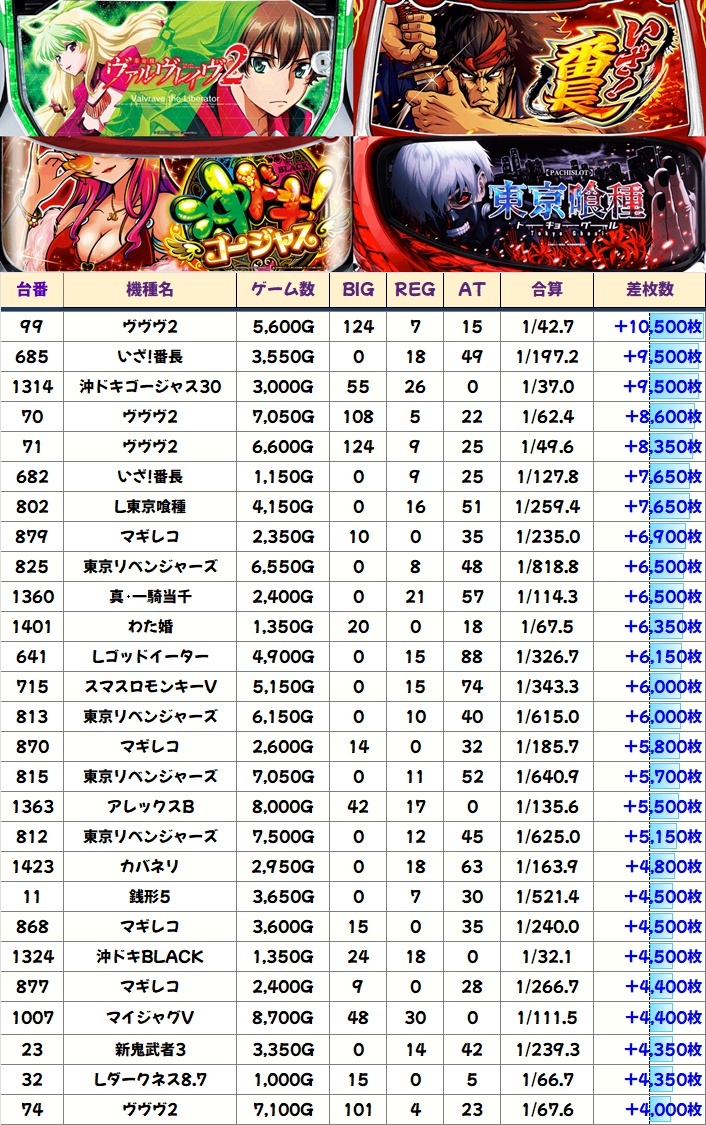 各機種+2000枚以上の優秀台をまとめてピックアップしますので、データをチェックしてみてください!
