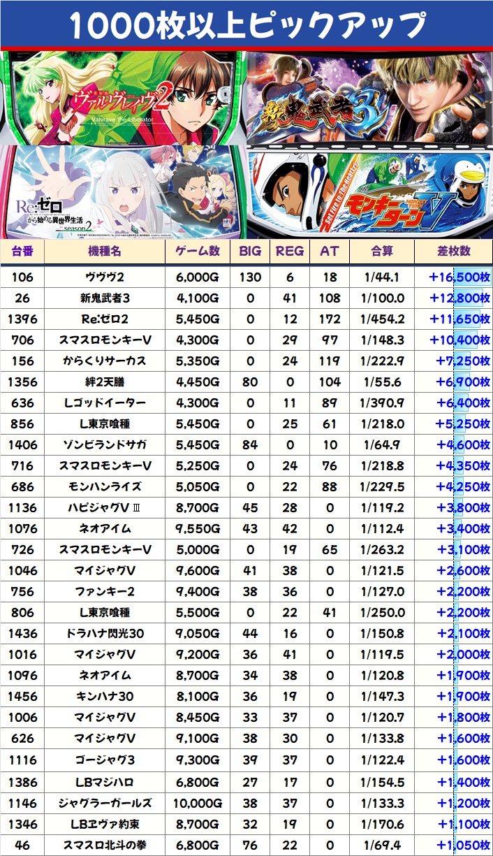 最新機種「ヴヴヴ2」&「新鬼武者3」&「Re:ゼロ2」&「スマスロモンキーV」と4台の万枚を筆頭に30台近い台が+1000枚以上と躍動!