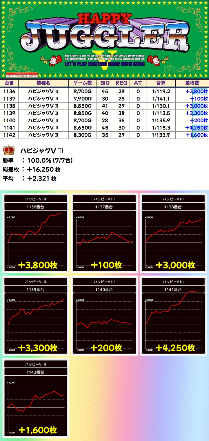 ハピジャグV Ⅲ(7/7台+)➡平均+2,321枚