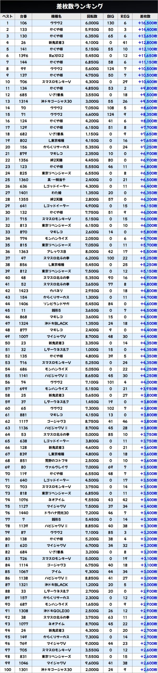 各機種の優秀台(+2000枚以上)をピックアップしますので、データをチェックして明日以降の立ち回りの参考にしてください!