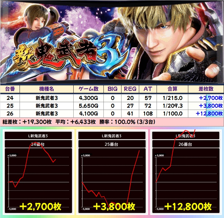 今回の特徴は質の高さ! 「新鬼武者3」の並びは万枚オーバーを筆頭に全台+2500枚以上で平均+6433枚、「モンハンライズ」&「ファンキー2」の並びも全台大幅なプラスで、それぞれ平均+4000枚以上、平均+2000枚以上と素晴らしい結果に!