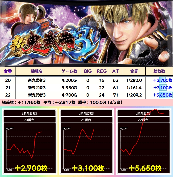 3機種に1/2系濃厚の仕掛けがあり、新鬼武者3からはお宝台が続出。+11900枚の万枚オーバーに加えて、+5000枚を超える爆発も複数アリ!
