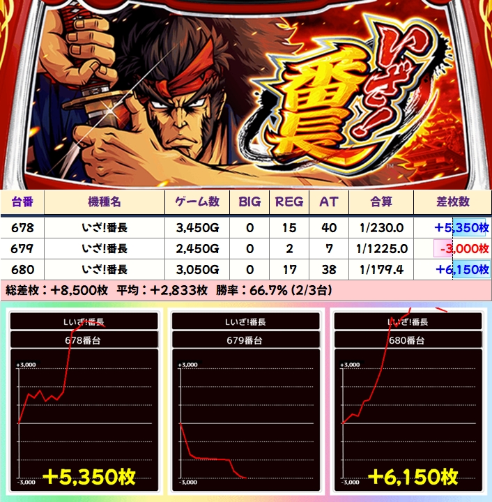 【3台並び】いざ番長(678-680番台)→平均+2,833枚