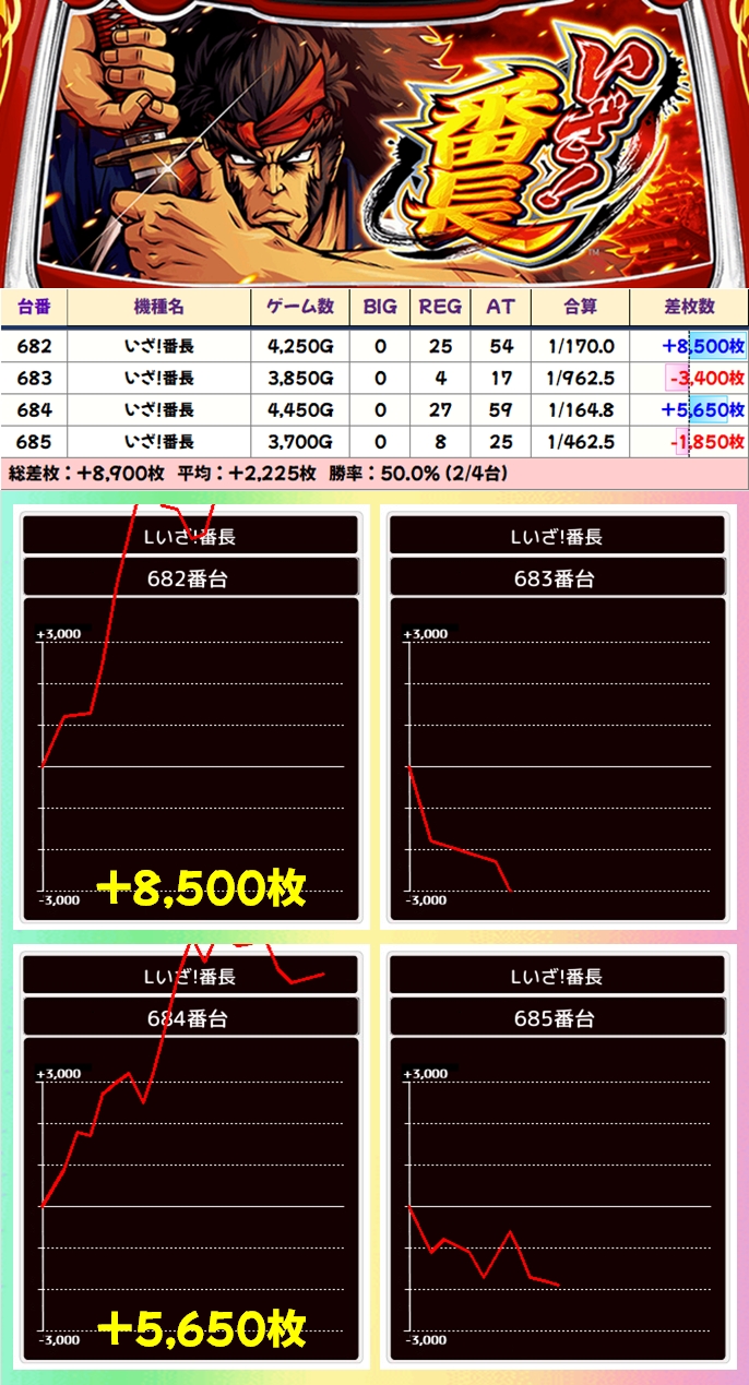 【4台並び】いざ番長(682-685番台)→平均+2,225枚