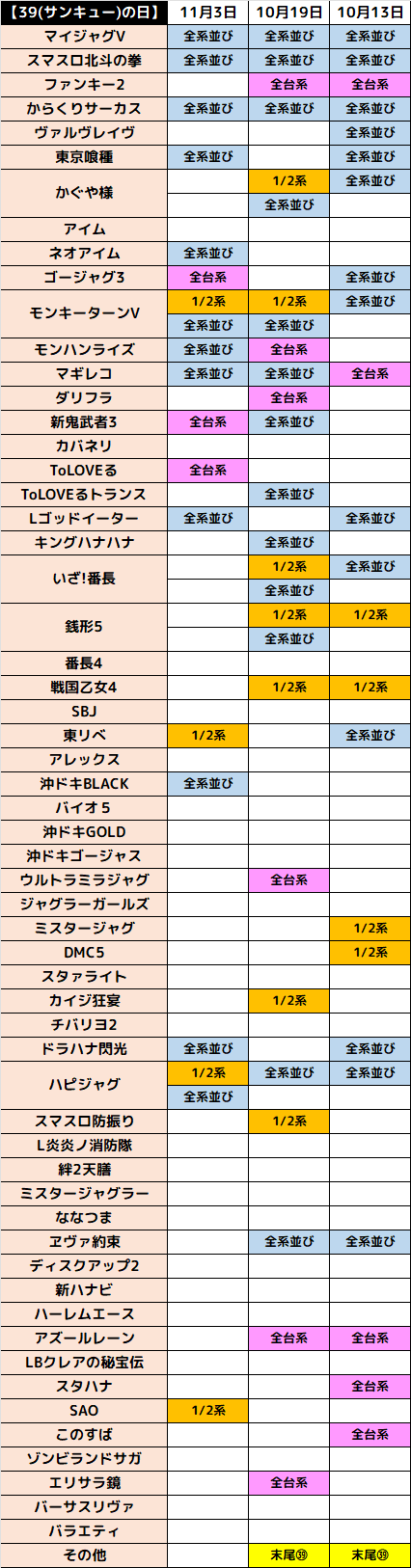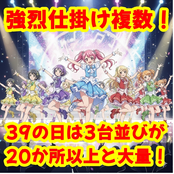 前回の39の日と同様に今回も優秀な3台以上の並びが20か所以上と大量!高配分機種以外からも優秀並びが大量に出現しているので、普段から扱いの良い機種や人気どころを確保できなくてもチャンスはあり!