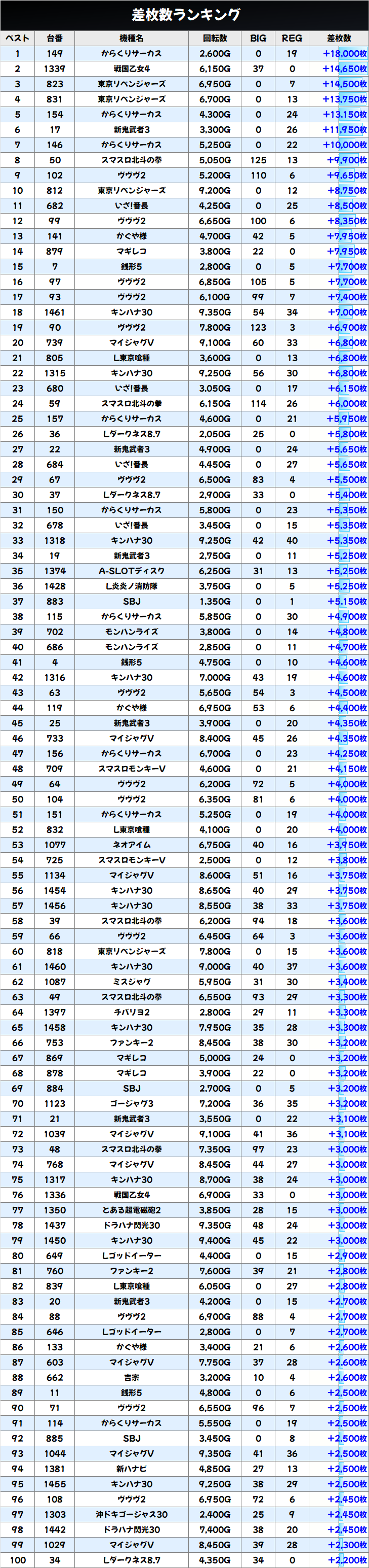 各機種の優秀台(+2000枚以上)をピックアップしていきますので、データをチェックして明日以降の立ち回りの参考にしてください!