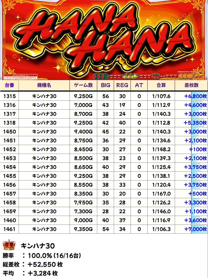 【全台系濃厚】キンハナ30(16/16台+)→平均+3284枚