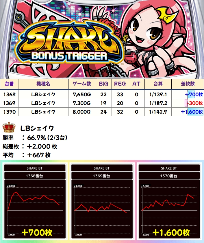 前前前世の初日から全力の気合を感じる仕掛けでした。また、シェイクBTは2日連続で全系仕掛けとなっており、各機種結果を残しました。