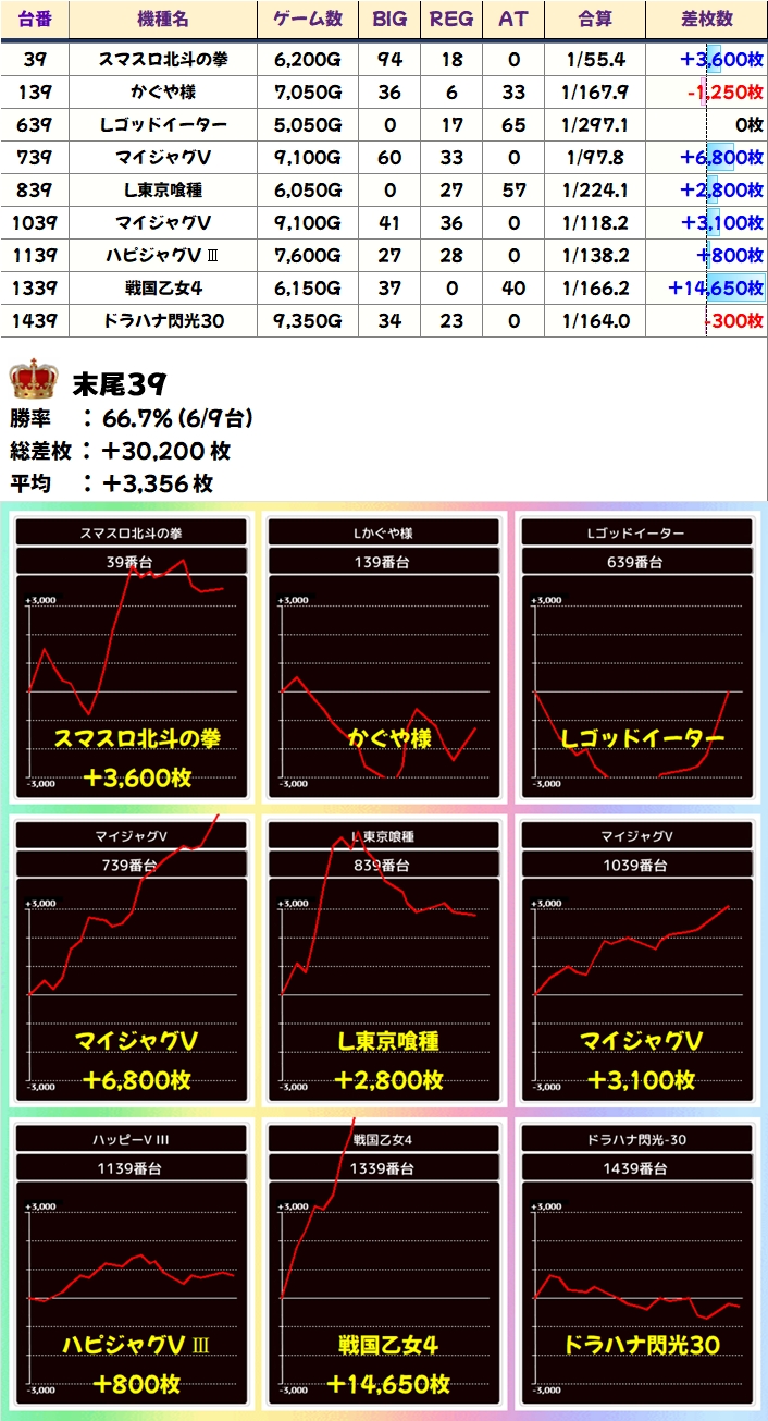 39の日は末尾39も優秀になることが多いので、良番であればねらい目です!6割以上がプラスで万枚台も確認!