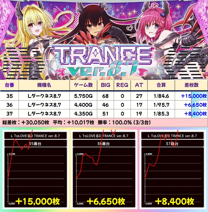 今回は下記の機種から1/2系濃厚の仕掛けを確認。いずれの機種もトータルでもしっかりプラスとなっており、大量出玉も出現しておりました。