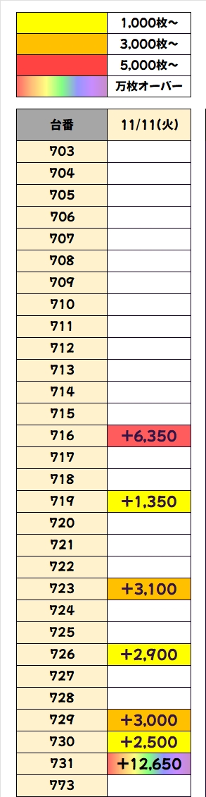 この日は3台並び仕掛けがありましたが、並び以外にも+2000枚超を複数確認できました。ポスターには11/11-20の日付が記載されているので、明日以降も意識しておきましょう。