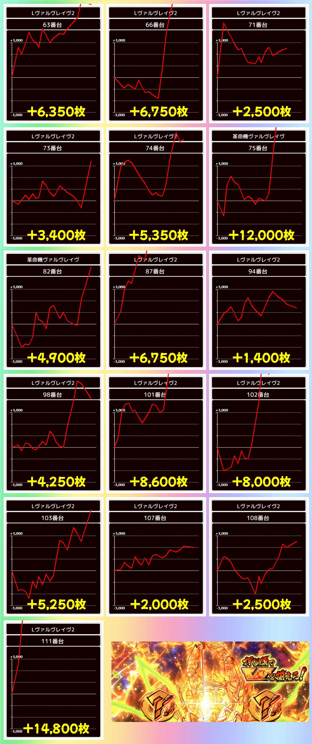 「ヴァルヴレイヴ」は新台の2だけでなく初代からも万枚超台あり!台数は2が多いので優秀台も2が多くなりがちですが、初代でも十分勝負できそうな結果ですよ!