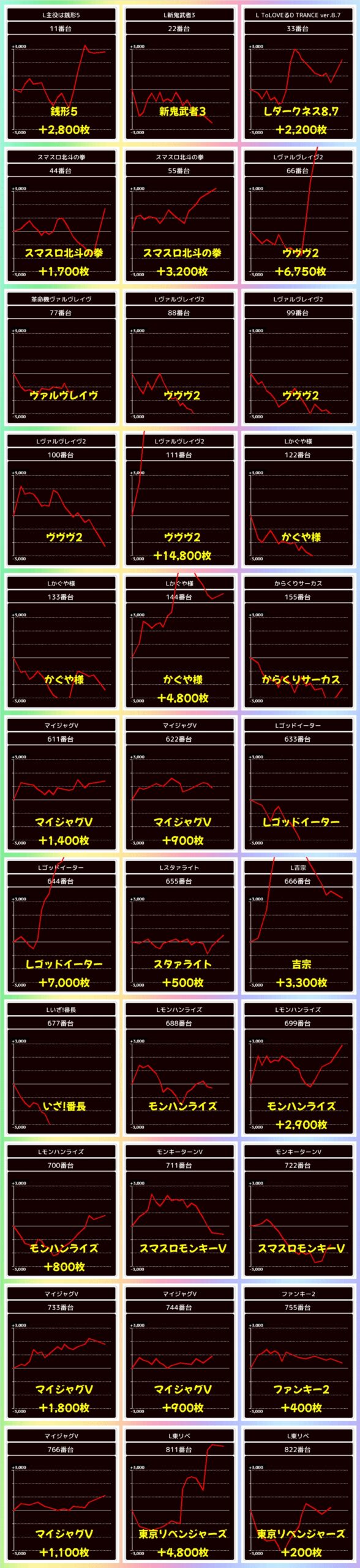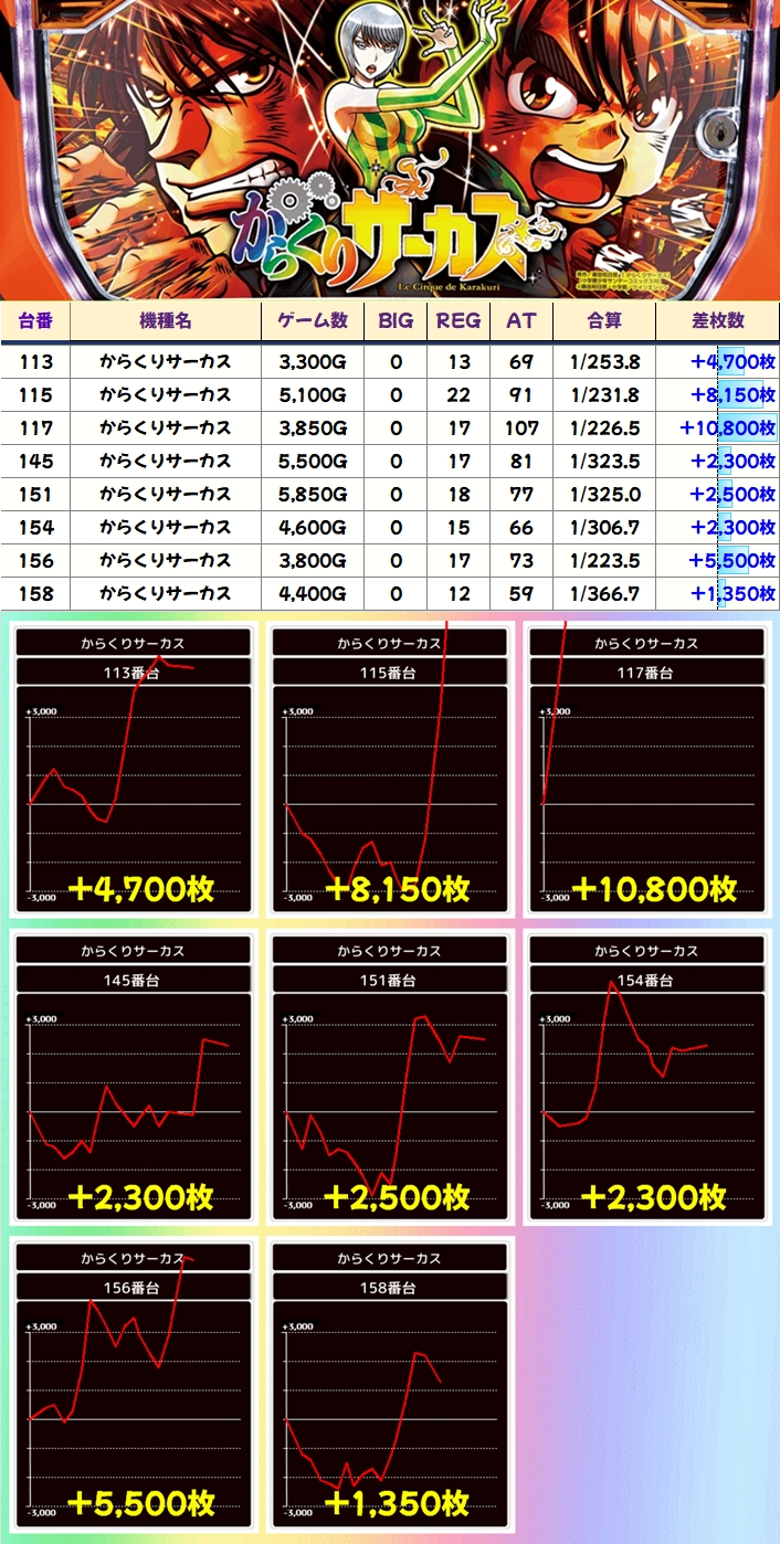 「からくりサーカス」は万枚超や5000枚超2台とかなり高ベースだった感じがあります。365日ポスターが新しくなった初日なので気合が入っていたのでしょう!