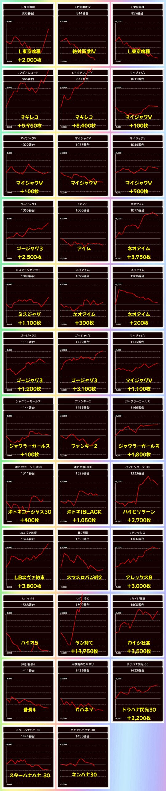 上記仕掛け以外にも単品も複数の優秀台を確認!かぐや様や東京喰種からは万枚クラスの台があり、そのほか各エリアから+3000枚超台が出現!