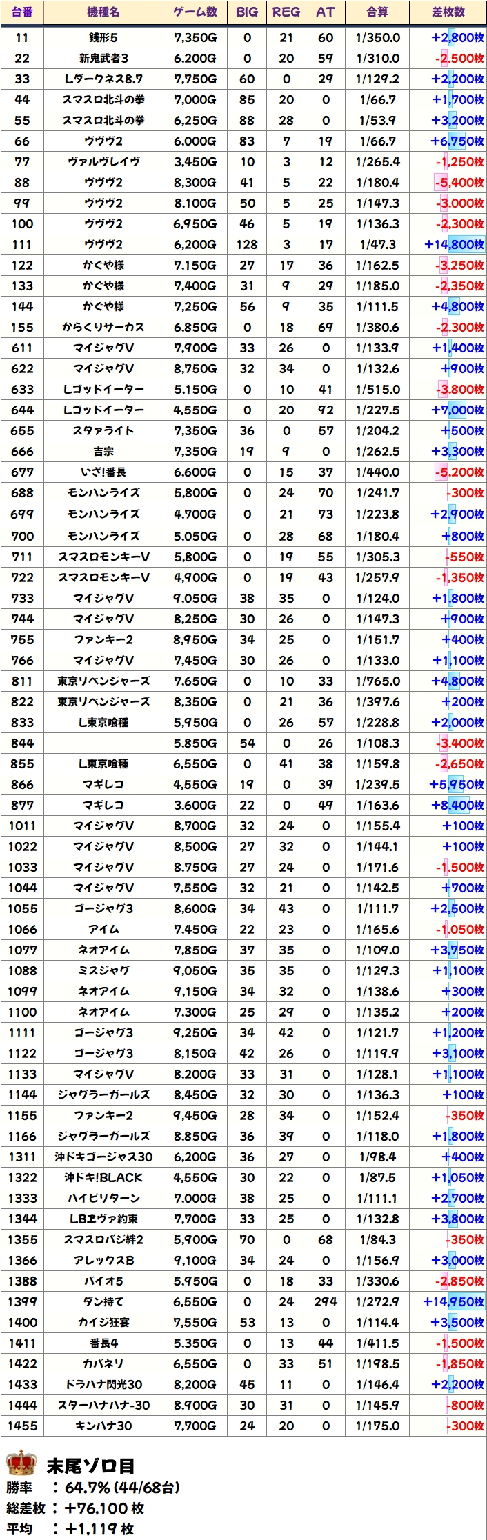 末尾ゾロ目台(44/68台+)➡平均+1,119枚