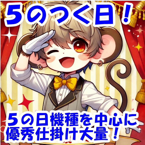 5のつく日は「ジャグラーシリーズ」「ハナハナシリーズ」「モンキーターンV」の5の日機種が狙い目となり、過去の仕掛けを見てもこれらの機種にはしっかり仕掛けが出現しております。また、Aタイプなどその他にも仕掛けが期待できる状況となっております!