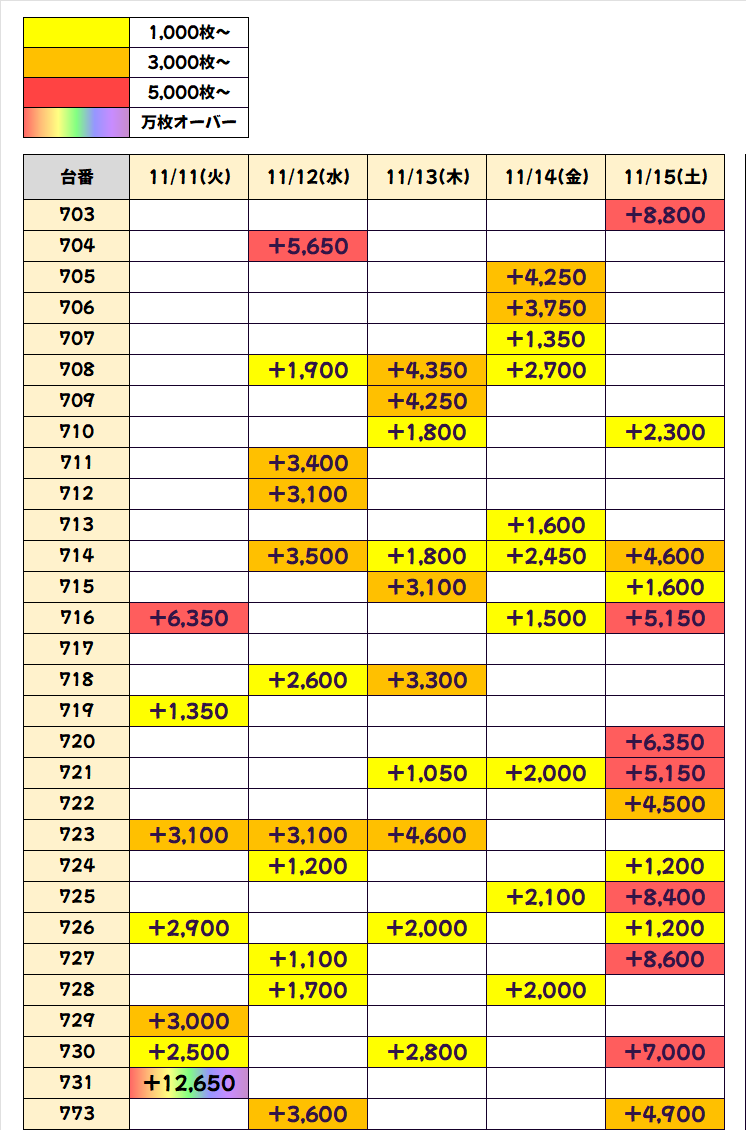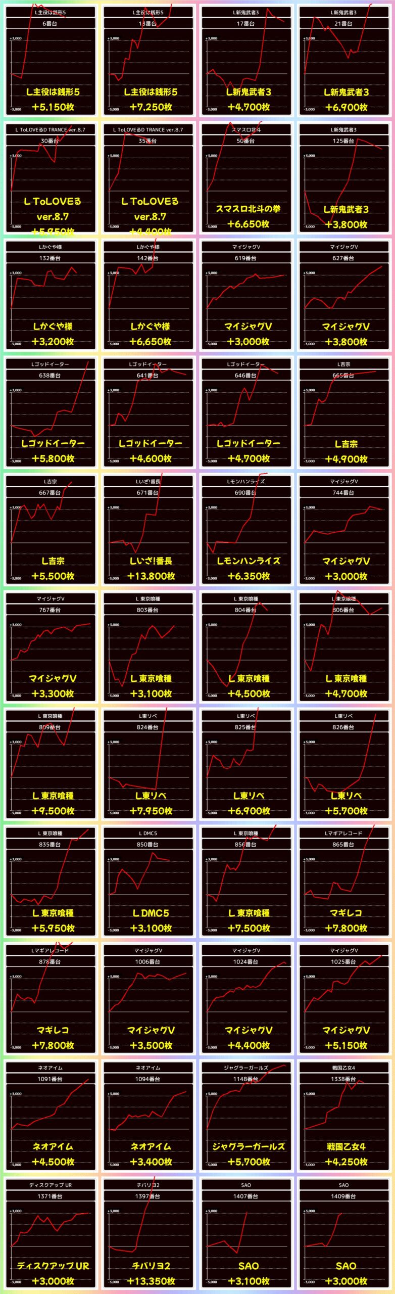 この日は5のつく日ということもあり+2000枚以上の台を11台確認でき、優秀並びも複数あり!