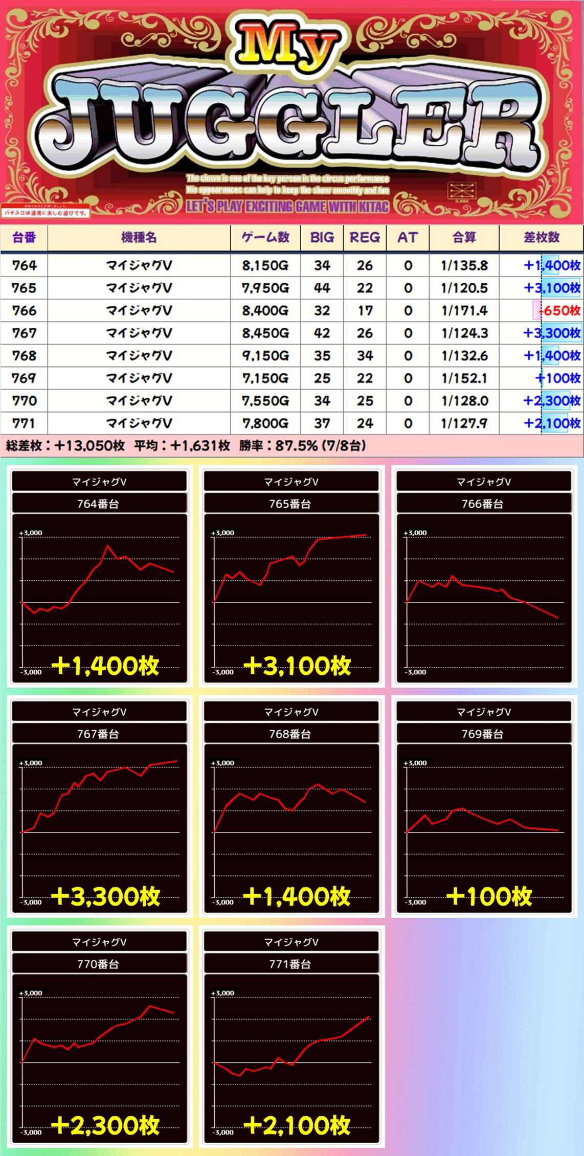 本日全台系と思われる機種は上記3機種!ジャグ・ハナ・ノーマルと3拍子揃ったバランスの良いラインナップとなりました。いずれも勝率100%で差枚もしっかりプラス!5の日は安定系の機種に仕掛けが入りやすいので、安心して責めることができますね!