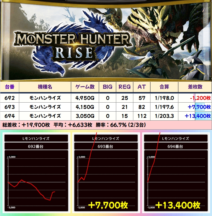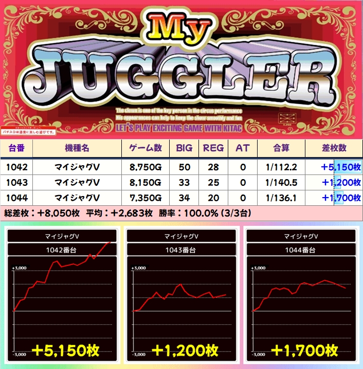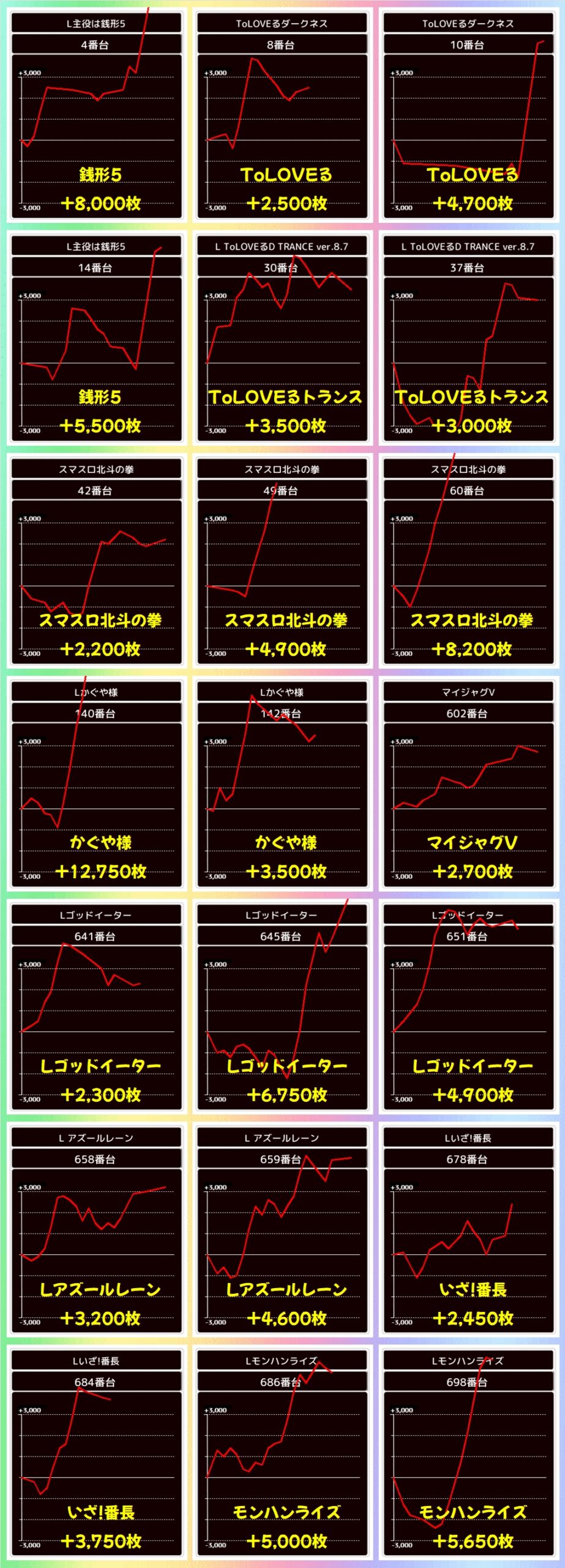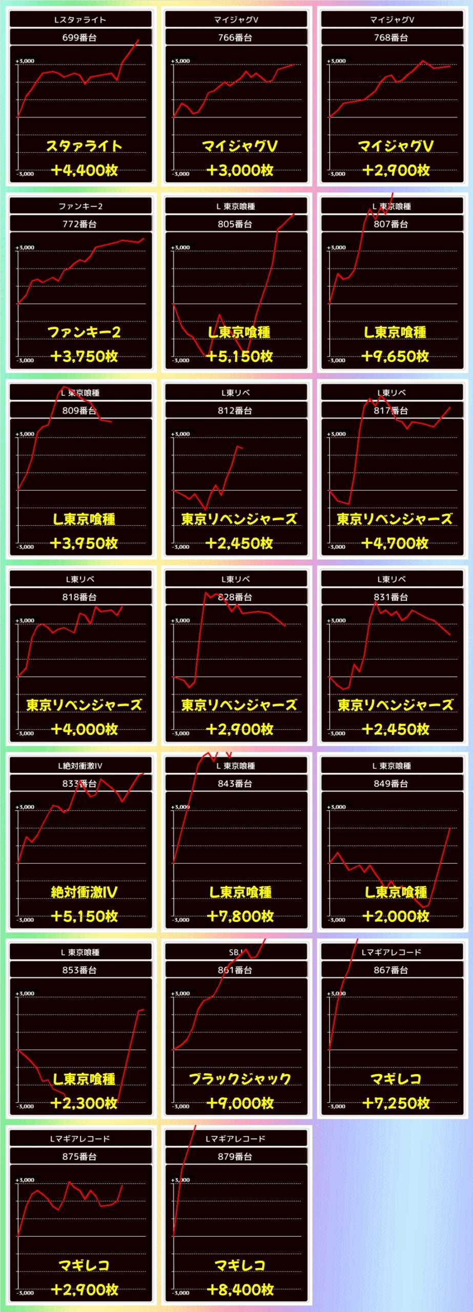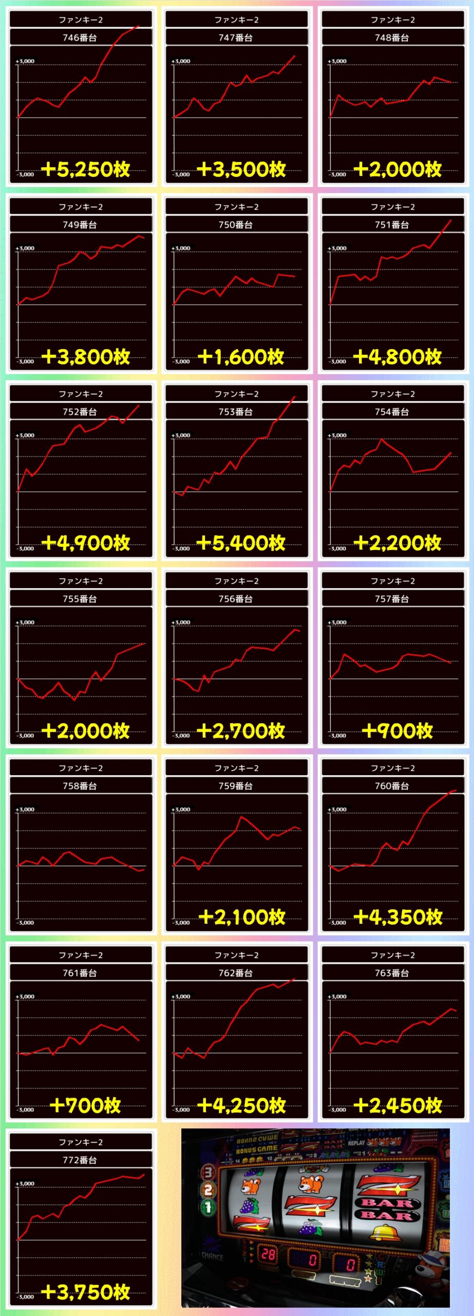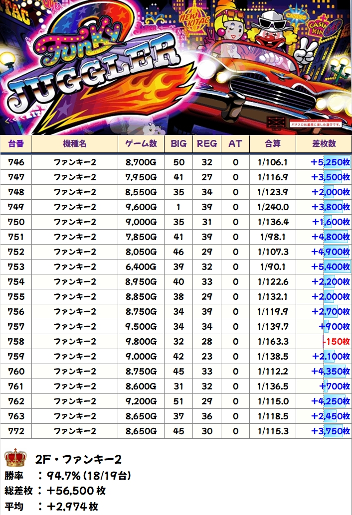 この日はかぶぽポストでヒントを確認できた『2Fのファンキー』が大爆発しており、勝率94.7%(18/19)、平均+2974枚と圧倒的出玉を記録!