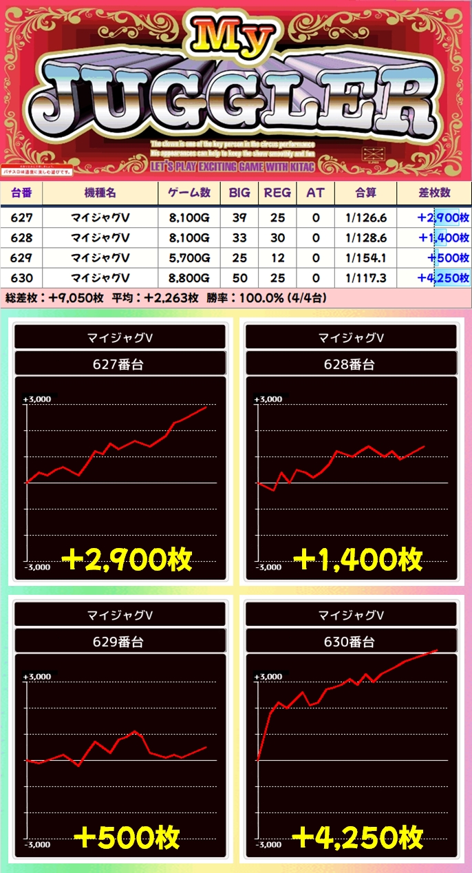 この日は全台系濃厚に加えて1/2系の仕掛けも用意されていたようで、優秀な結果を残した機種を多数確認!