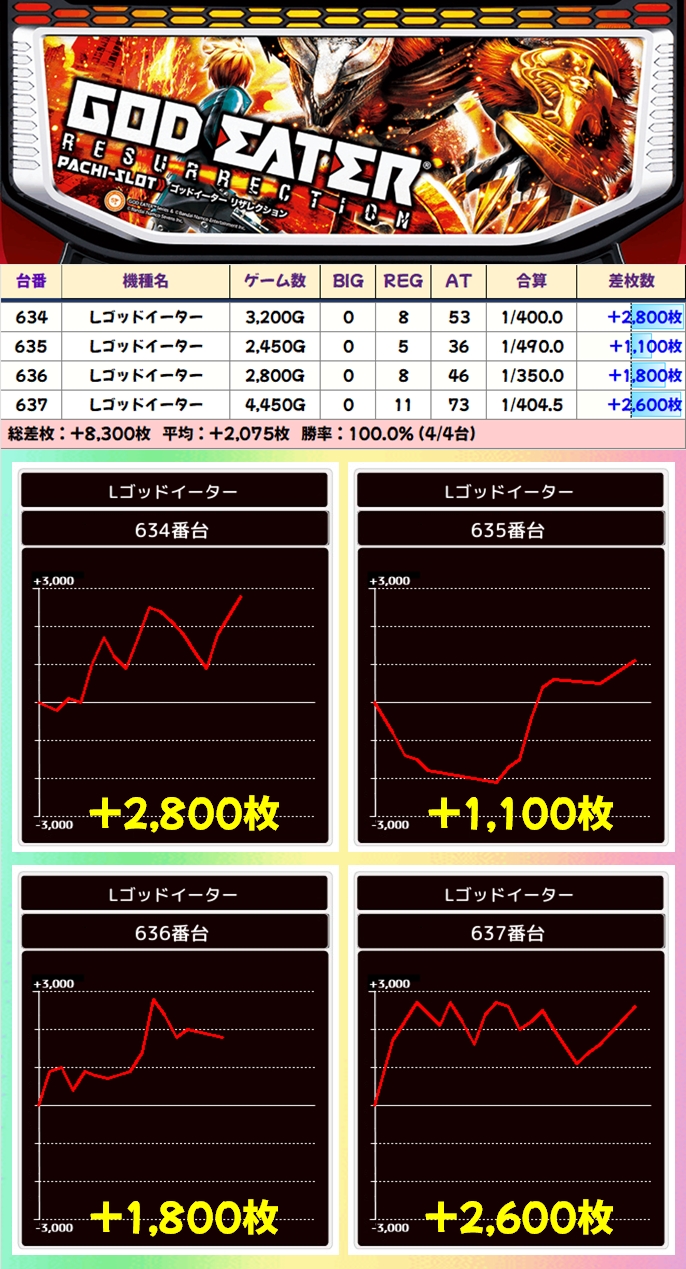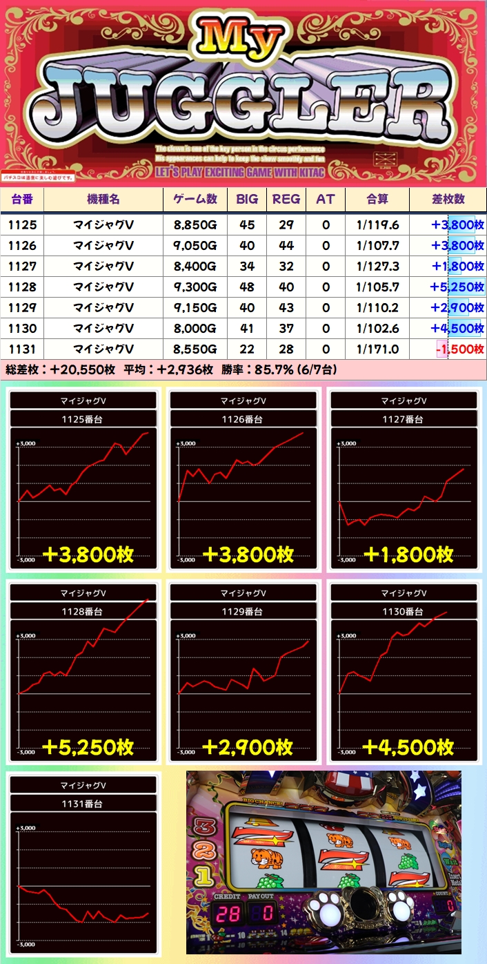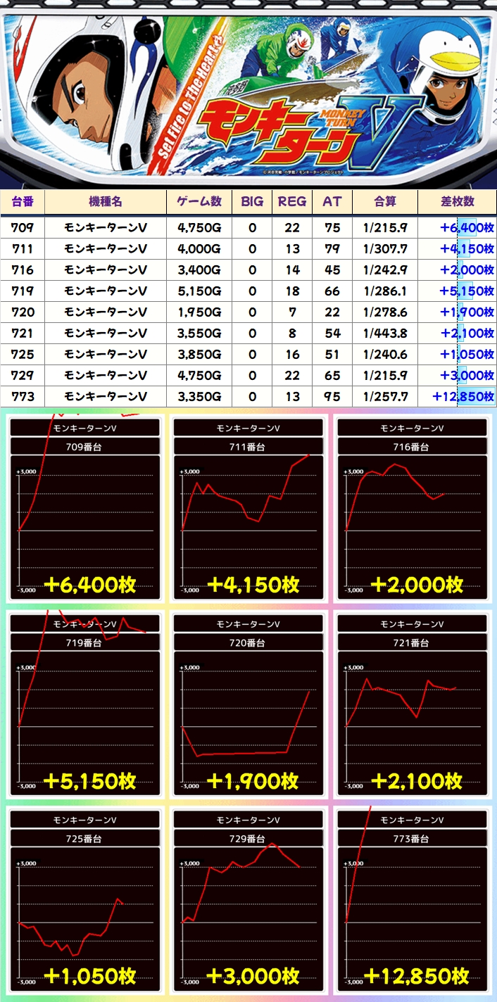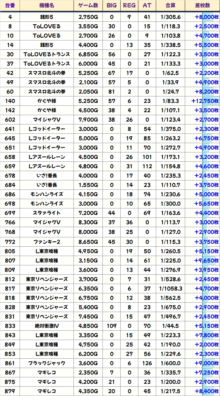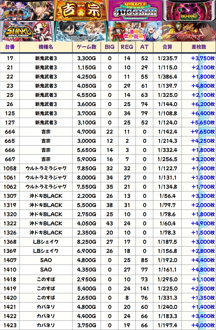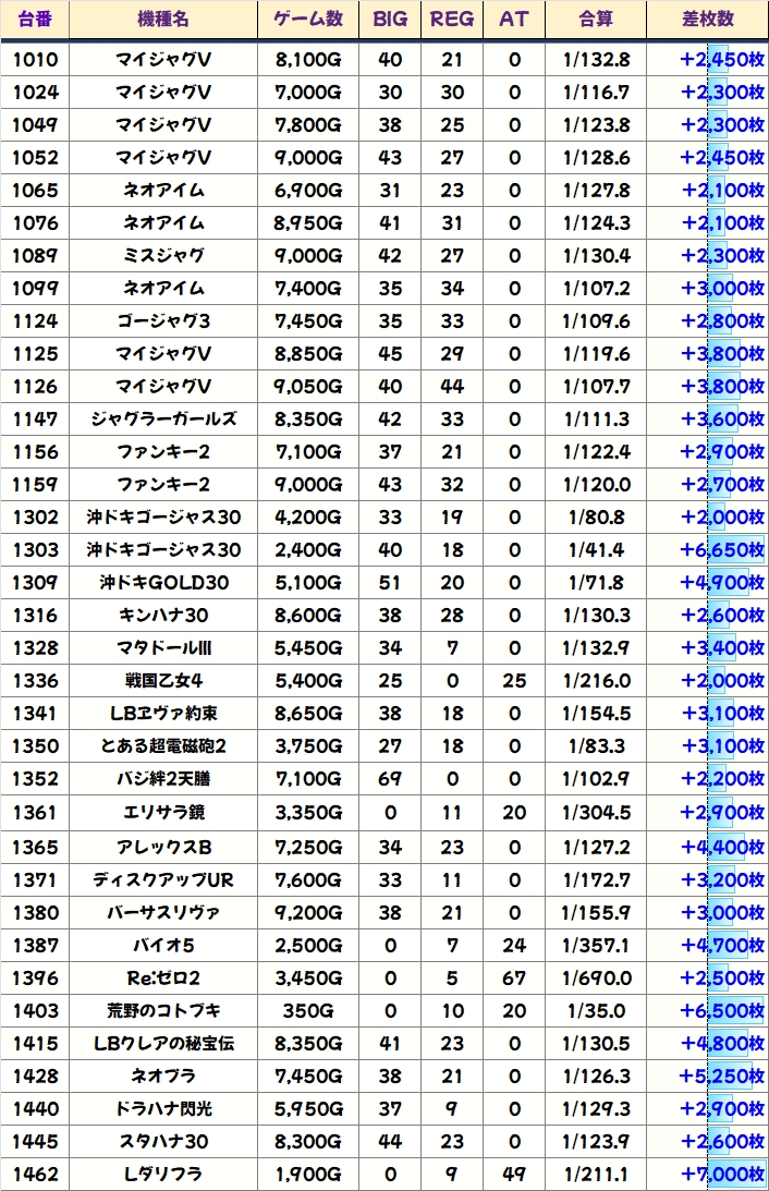 冒頭でも触れた通り、7のつく日は3台以上の機種に1台以上の優秀台が登場するのが特徴となっており、この日も例に漏れず様々な機種から優秀台が出現!