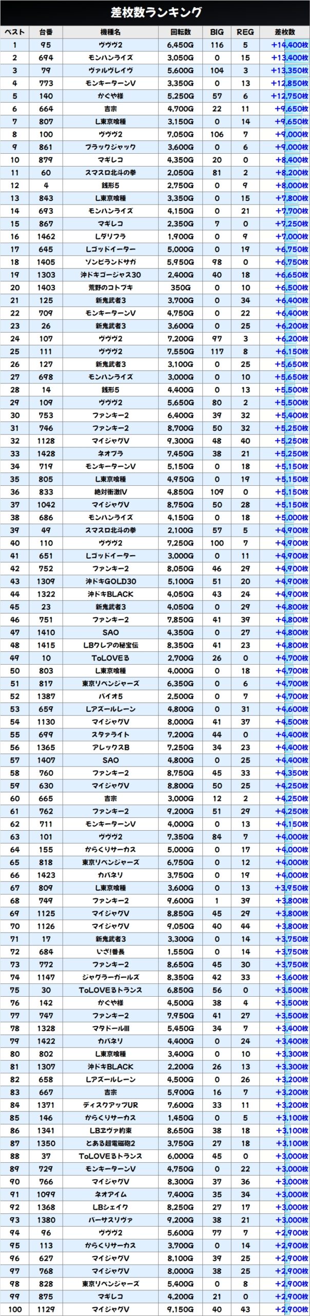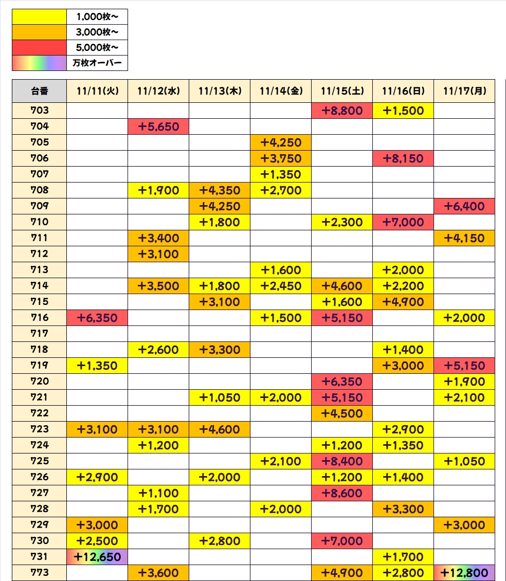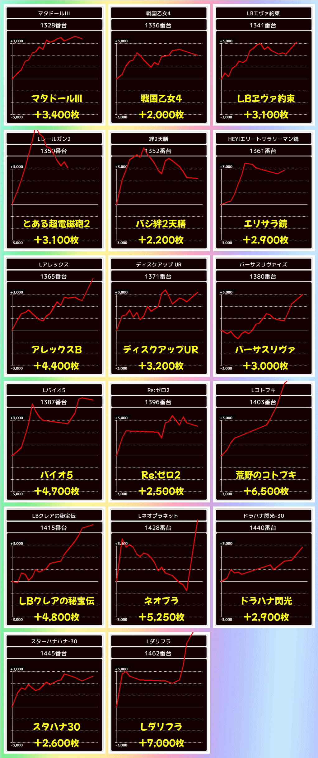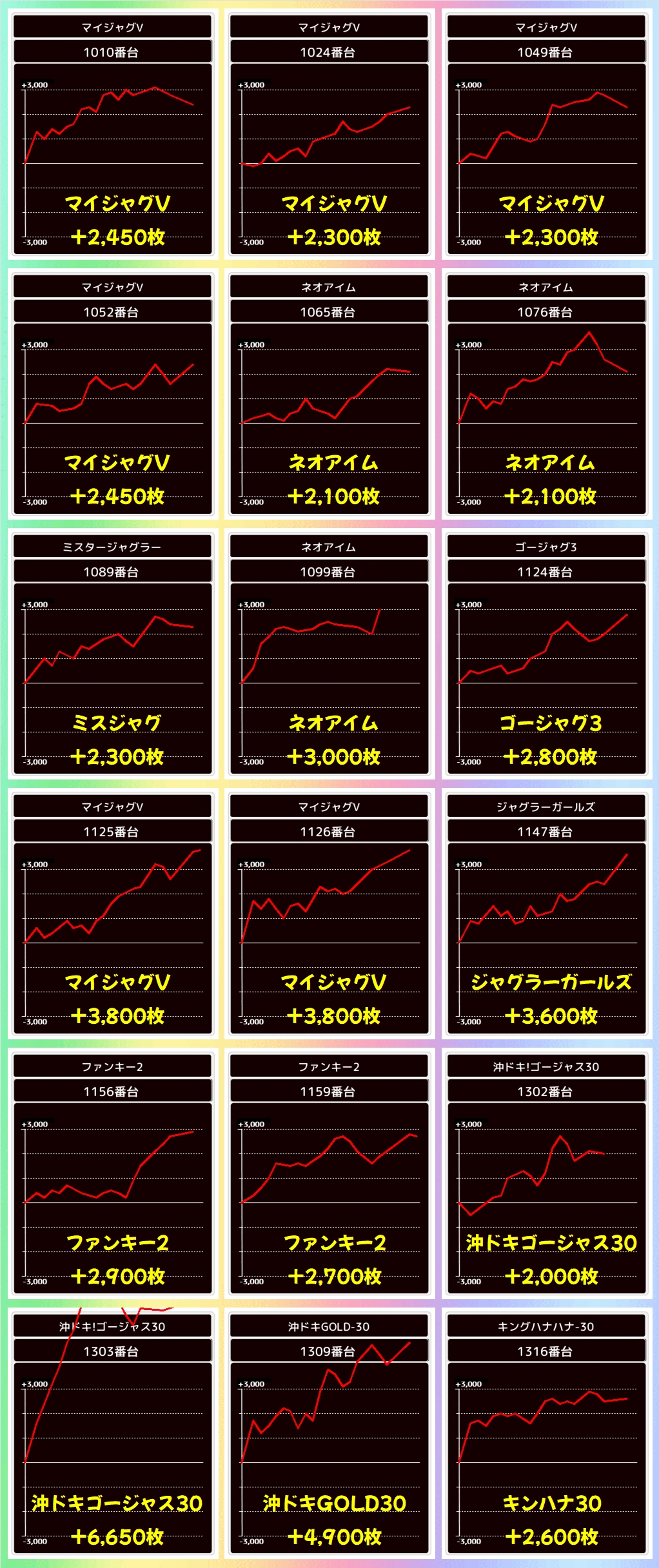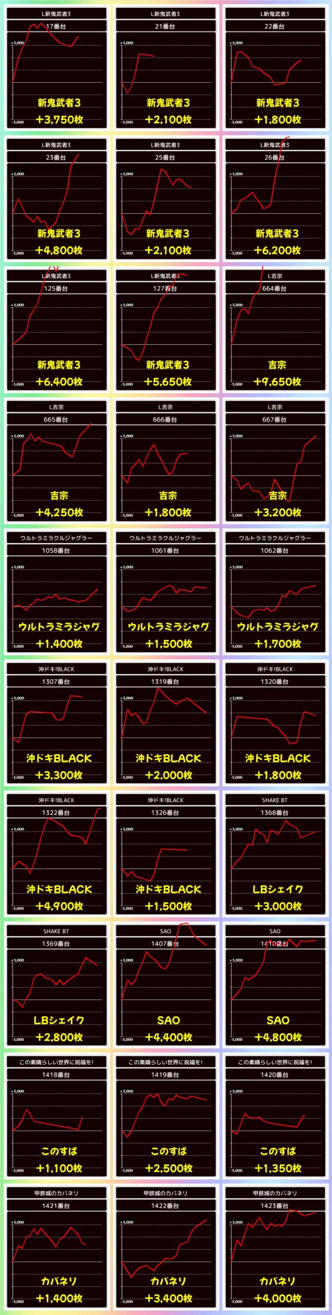 上記の機種からは大量出玉も多数出現しており、+5000枚オーバーの台も複数出現。