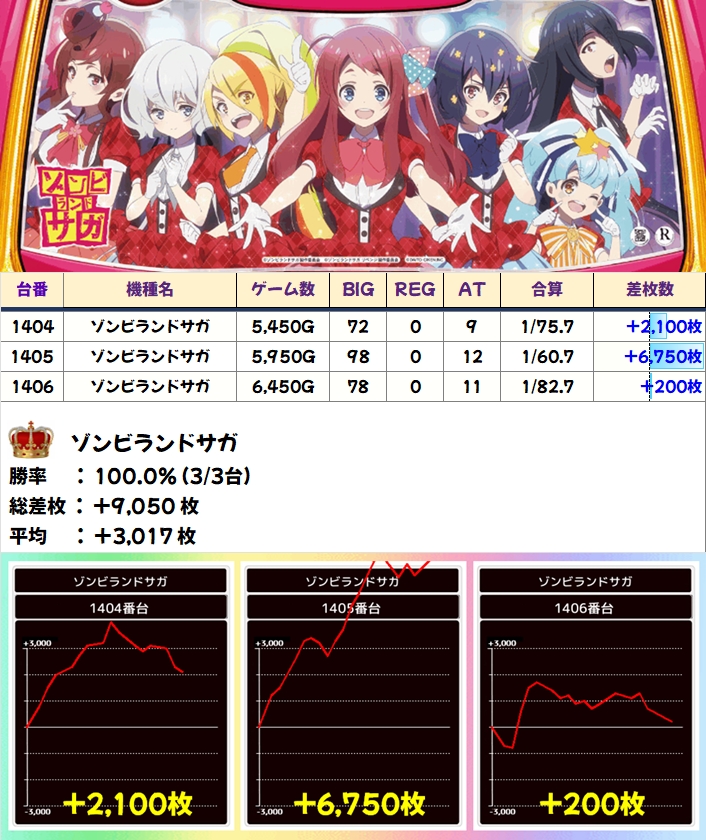 また、同じく全台系濃厚となったゾンビランドサガも、3台ともプラス差枚と質の高い結果になっていましたよ!