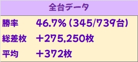この日はホール全体が高配分になっていたようで、総差枚+27.5万枚、平均+372枚と圧倒的な出玉を記録!