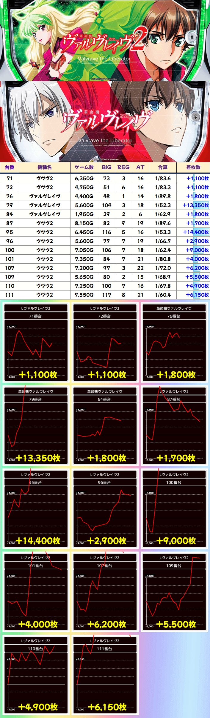 最新台のヴヴヴ2からも3台並びを複数確認でき、どちらの並びも平均+5000枚前後と大量出玉を叩き出していました。