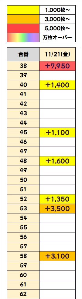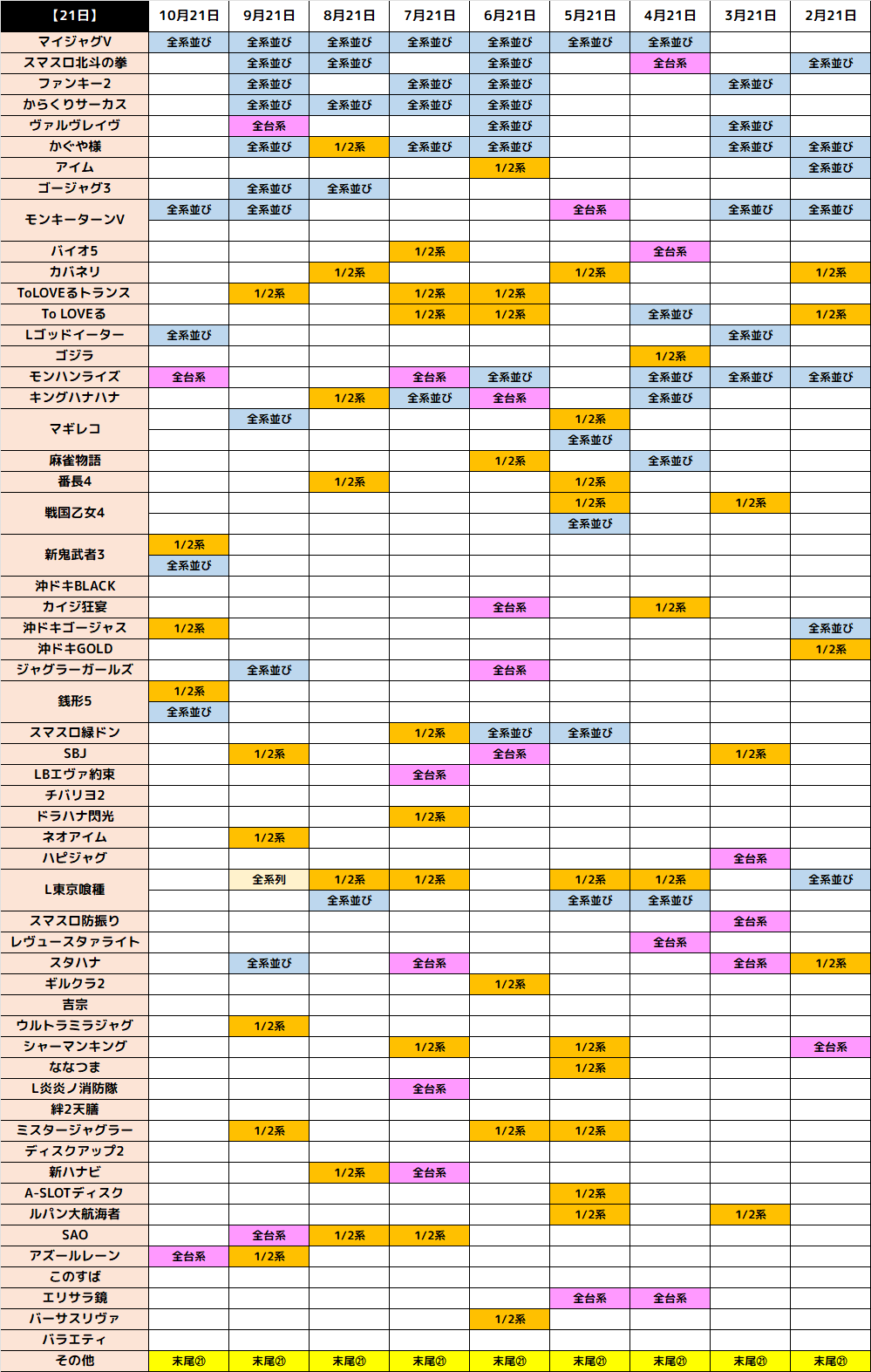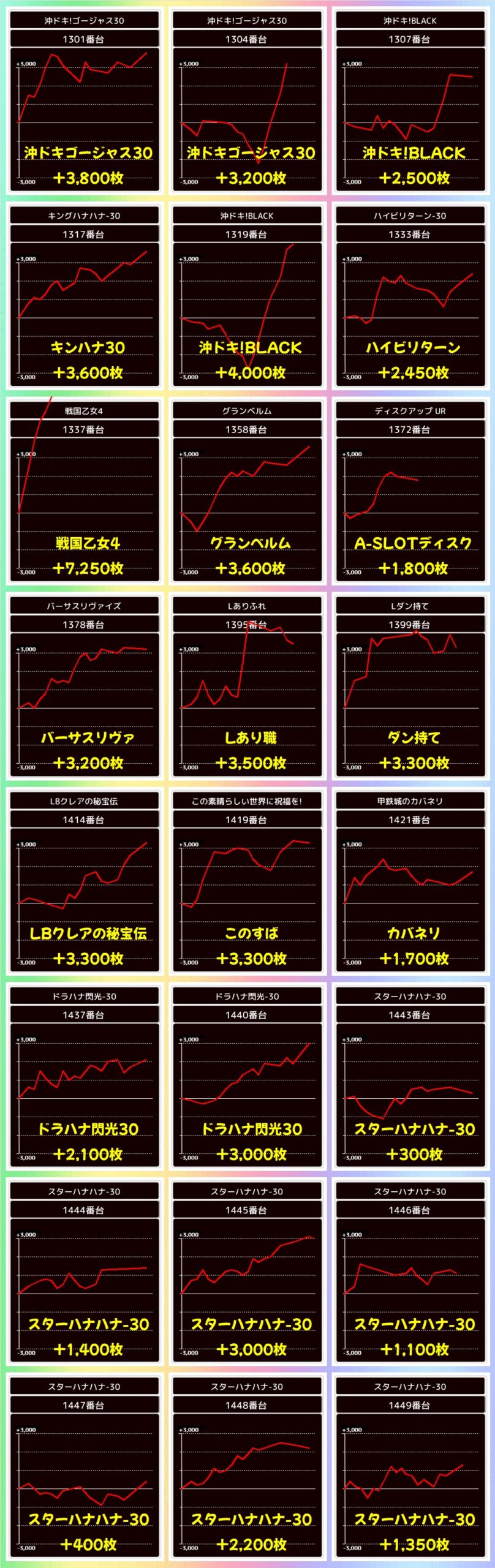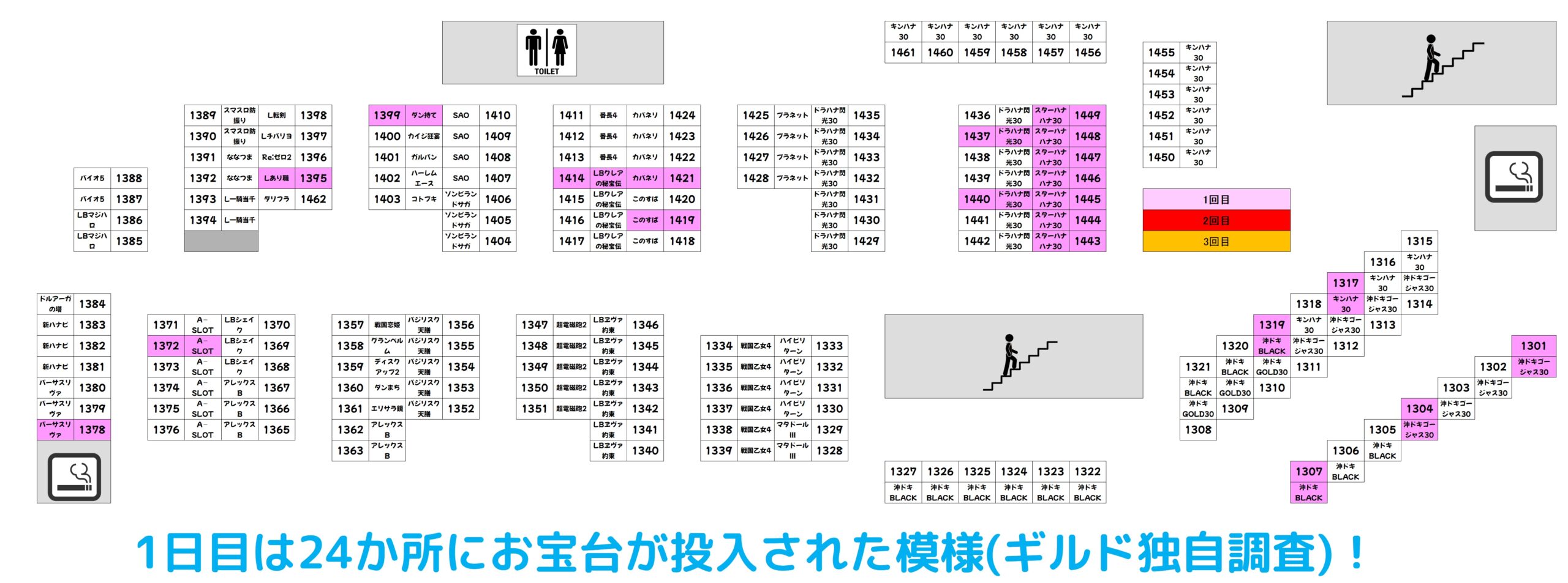 過去結果を見てもわかるように日付末尾は毎回優秀で、対象フロアは連続することもあるので仕掛けも連続で入っている機種も複数見受けられます。