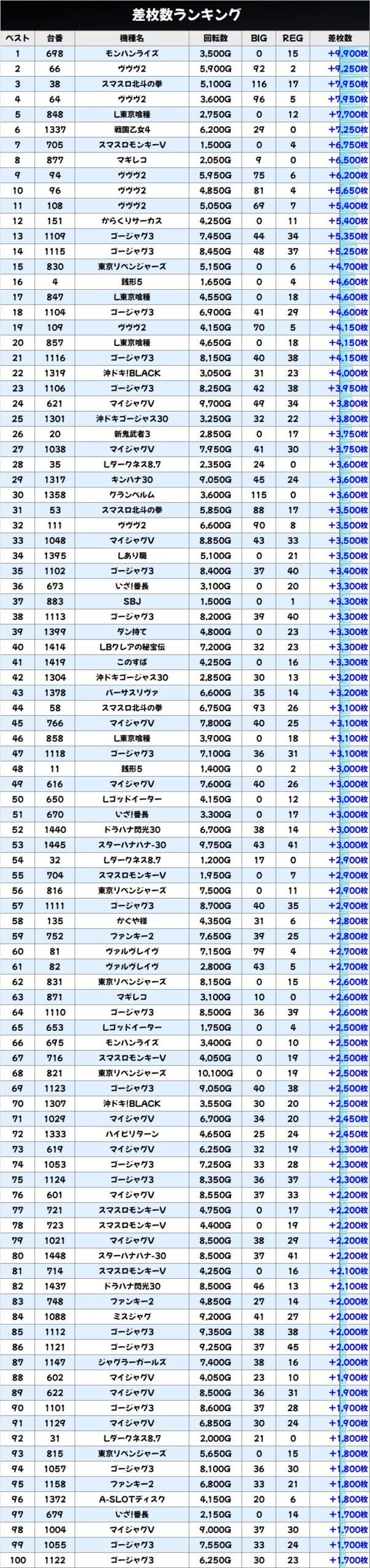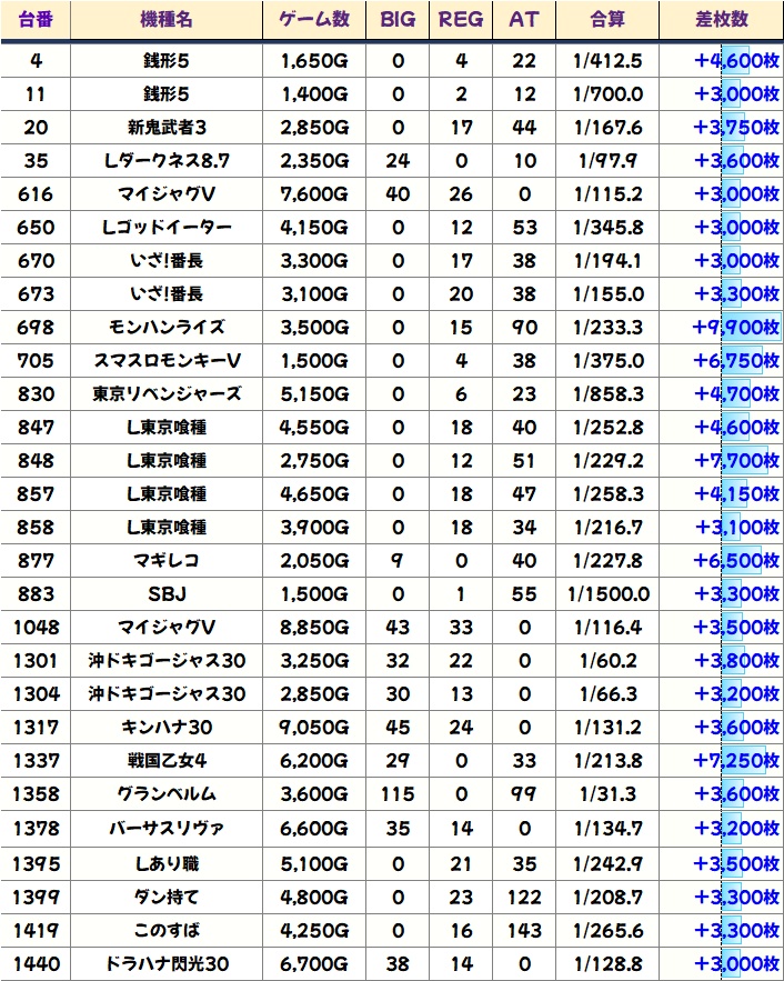 先月に引き続き今回も4Fが対象となっていたようで、20機種以上の優秀台を確認!上記は総差枚が6万枚超となっており、明日以降も4Fにはお宝台が大量となることは間違いないので良番であれば4Fから狙いたい!