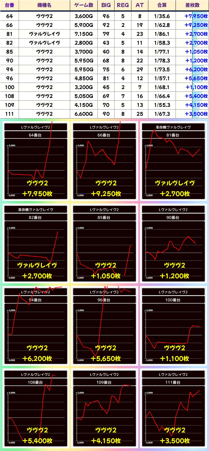 ヴァルヴレイヴ2から9000枚や5000枚超複数と大量獲得台あり!初代も2000枚超が2台とまだ戦える状況ですよ!