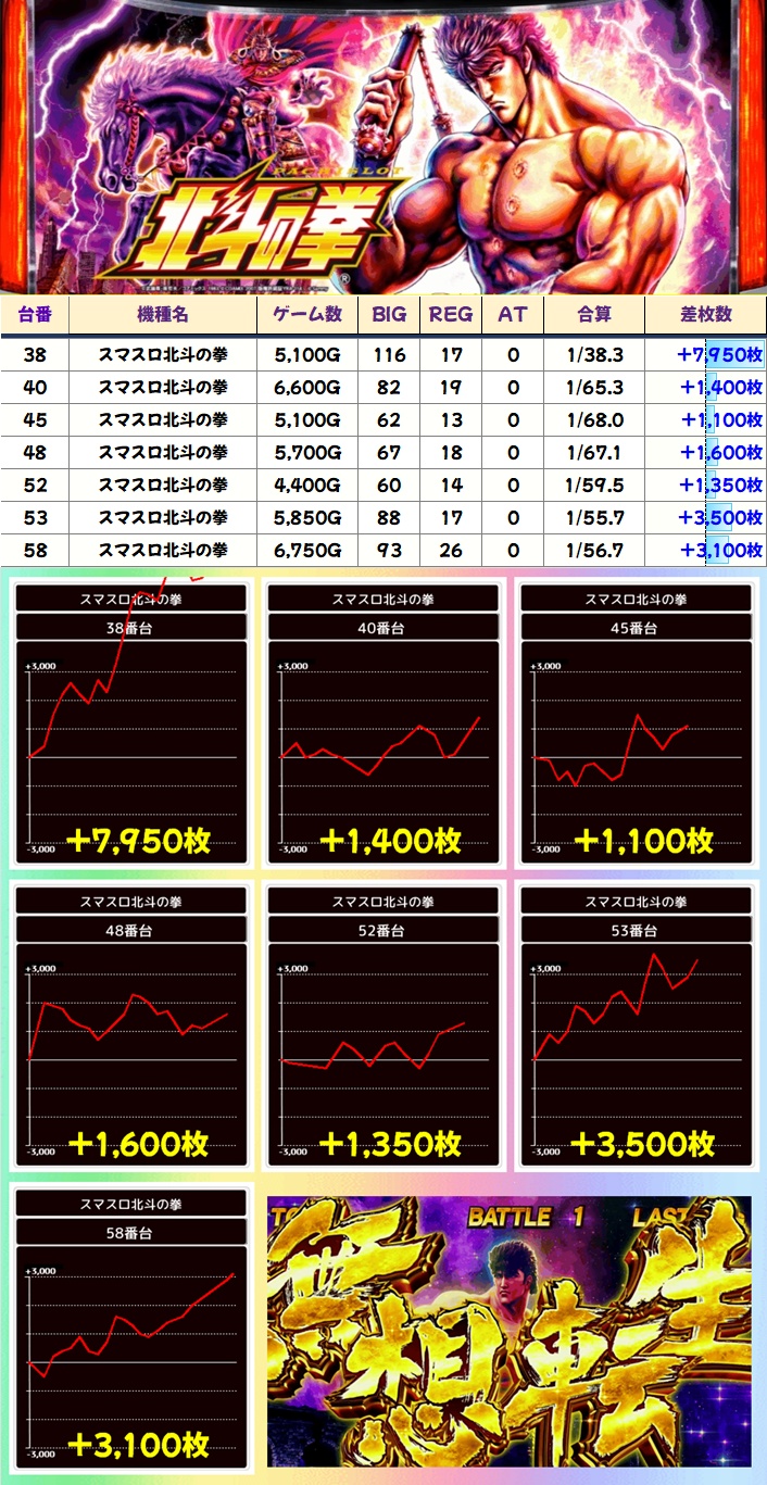 7000枚や3000枚複数と新ポスター登場初日は北斗に強烈仕掛け!また、北斗に限り末尾⑧が平均3000枚超となるほど優秀だったので、末尾仕掛けもあった可能性あり!明日以降も末尾や並びなども意識して立ち回ると良いかも!?