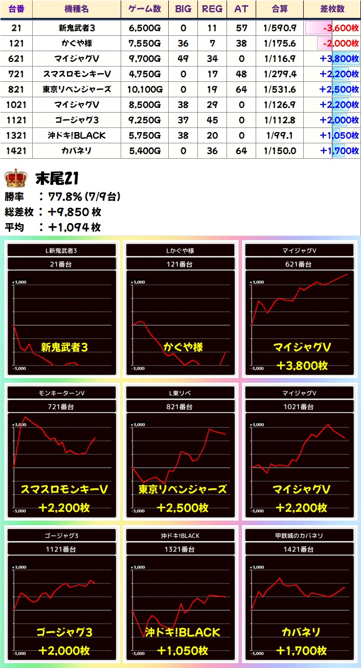 激熱7daysの7日間は毎日日付末尾が優秀になりがちで、今回は21日なので末尾21に優秀台が集中!明日以降も入場番号が抜群に早ければ日付末尾から攻めるのがよさそうですよ!