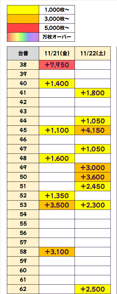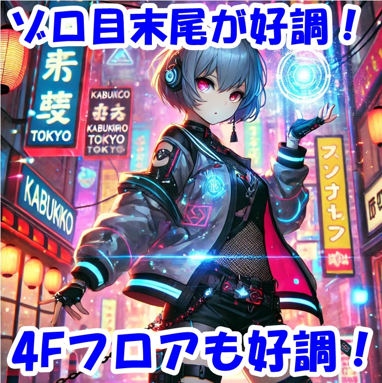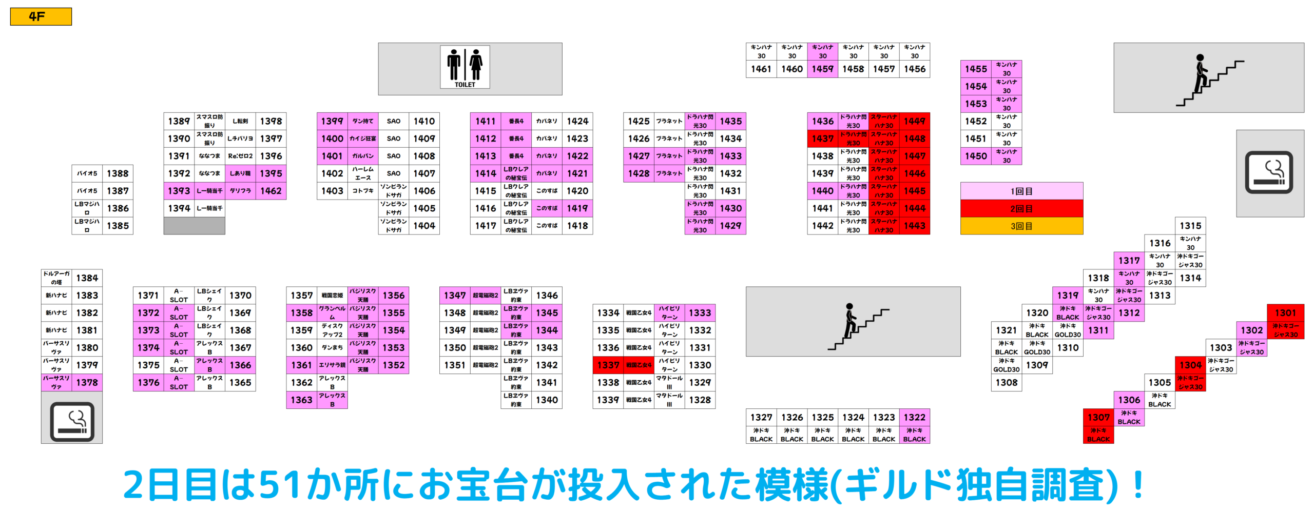 過去の傾向として、27日までは対象フロアでのお宝台の大量投入に期待できますので、明日以降は積極的に4Fフロアを狙ってみるのも手ですね。