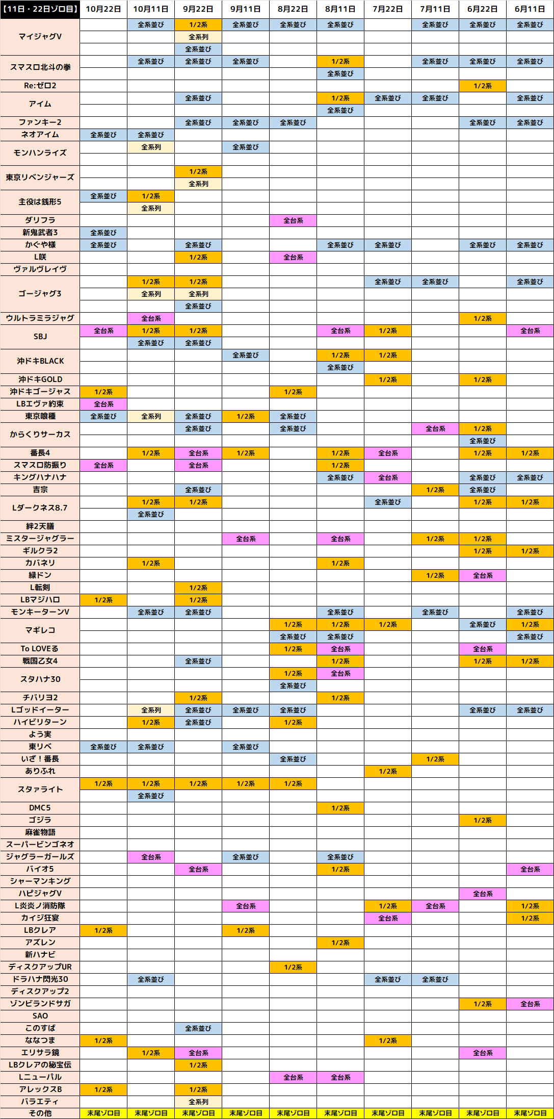 毎月21日~27日は日付け末尾の台番が強くなる傾向があり、さらに22日のゾロ目の日はゾロ目末尾が狙い目となるのが恒例です。