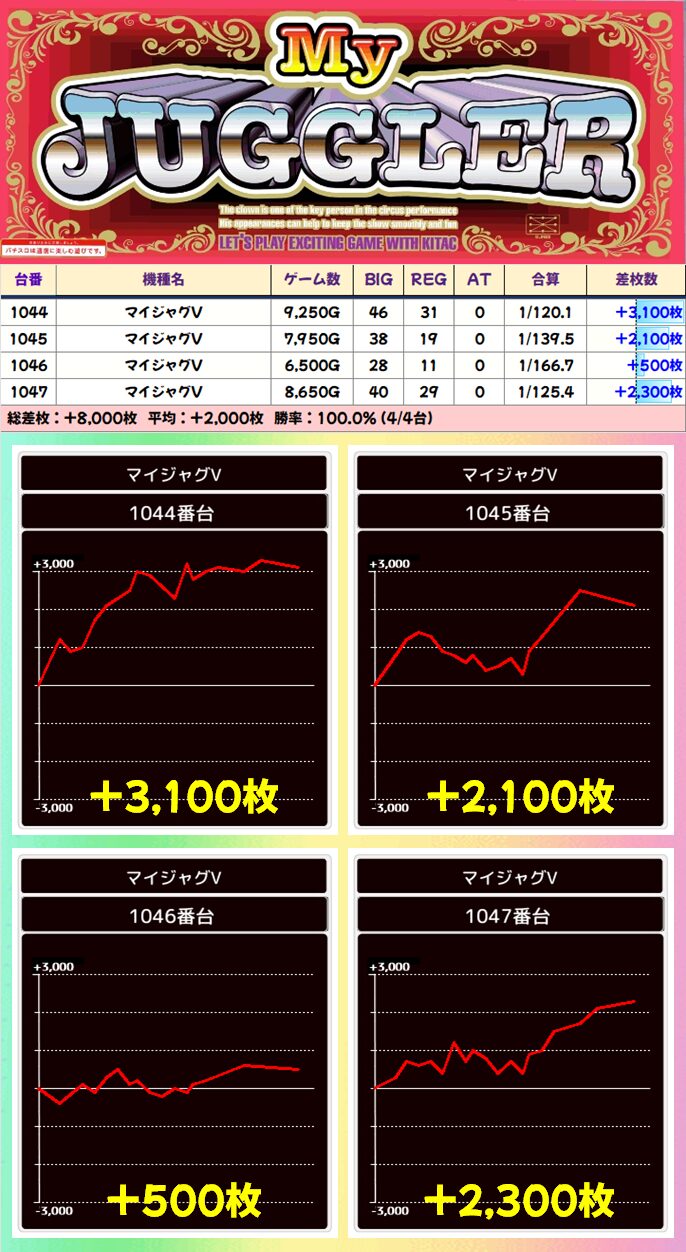 【4台並び】マイジャグ(1044-1047番台)→平均+2,000枚