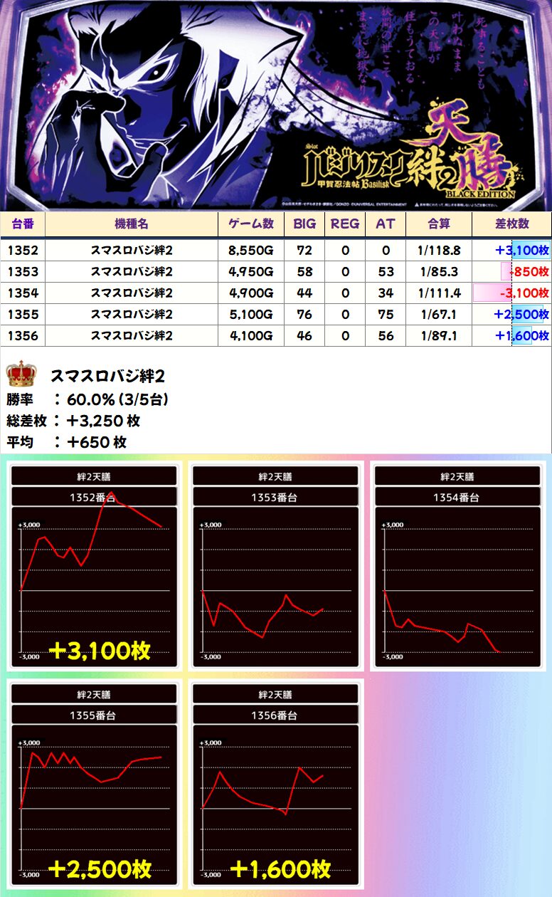 スマスロバジ絆2 (3/5台+) ➡平均 +650枚