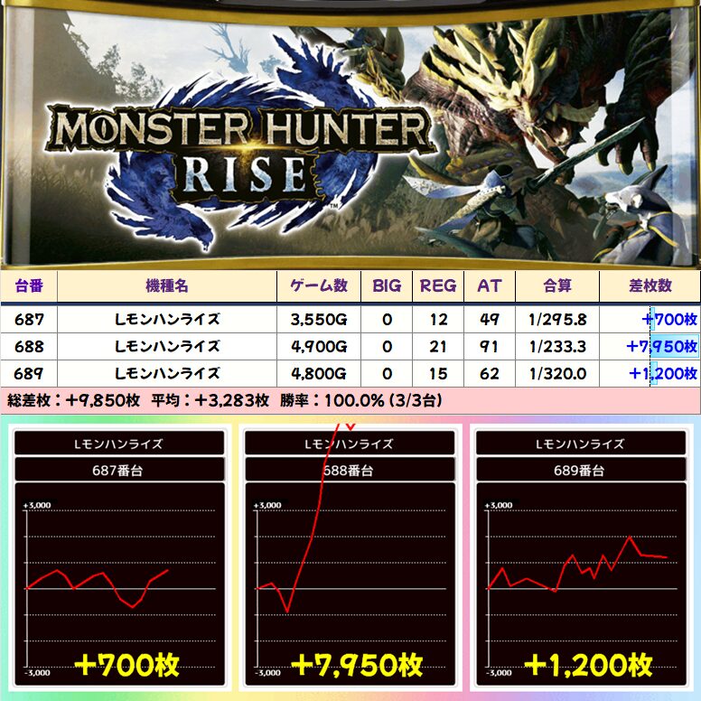 【3台並び】モンハン(687-689番台)→平均+3,283枚