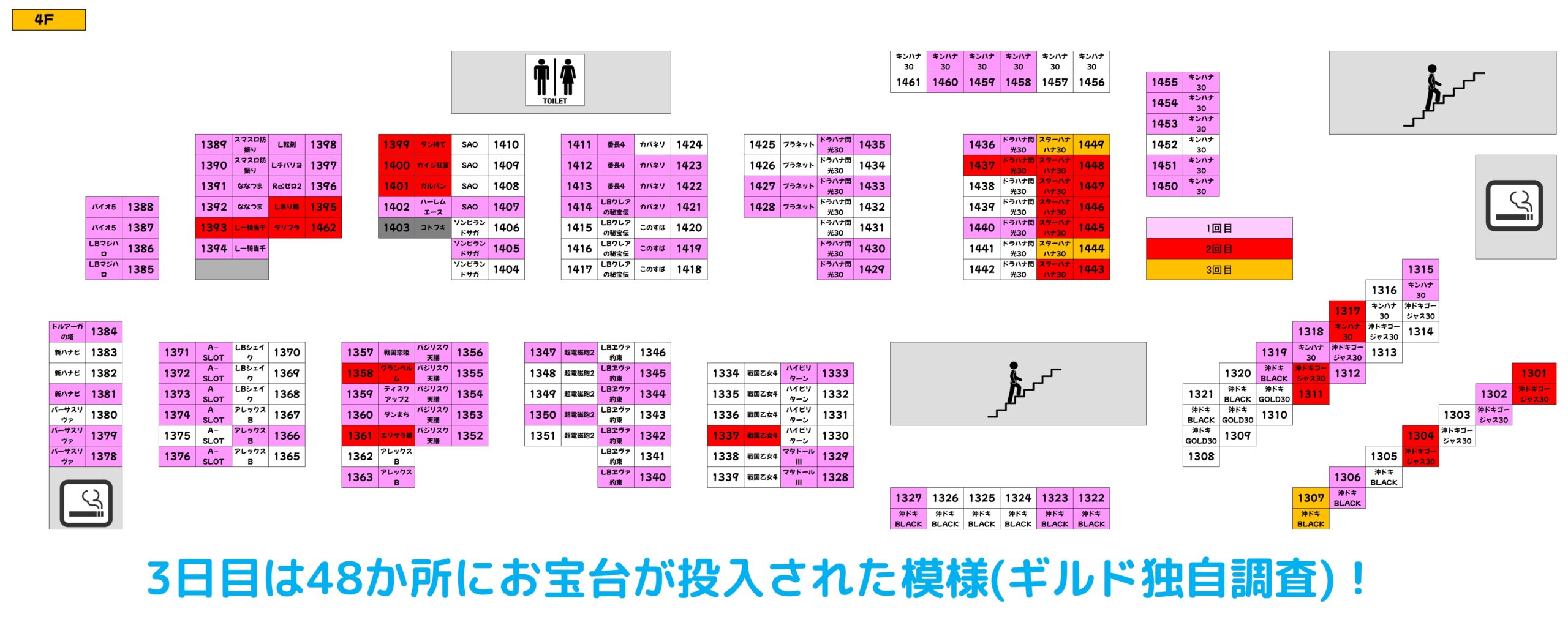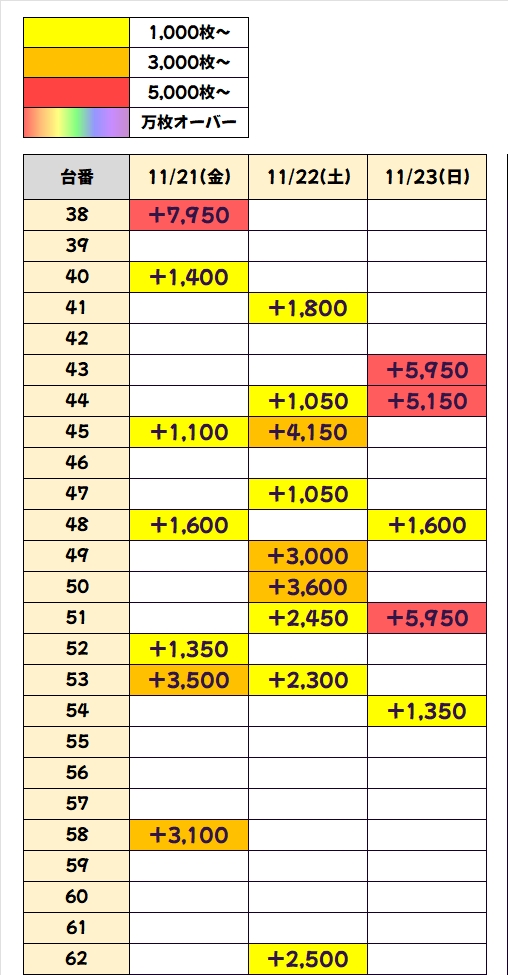 過去の傾向的に、激熱7daysの期間中(21日~27日)は対象フロアにお宝台大量に用意されると思いますので、明日以降も積極的に4Fフロアを狙っていきましょう!